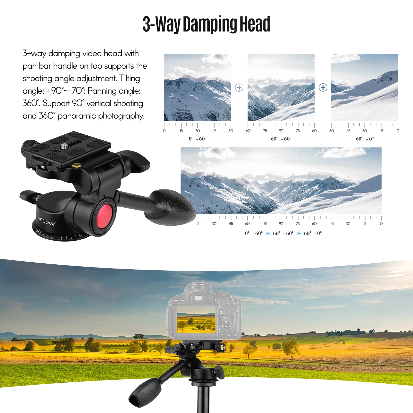 3-полосная демпфирующая головка с ручка сверху поддерживает регулировки угла съемки. Угол наклона: + 90 ° ~-70 °; Угол панорамирования: 360 °. Поддержка вертикальной съемки на 90 ° и панорамной съемки на 360 °.
