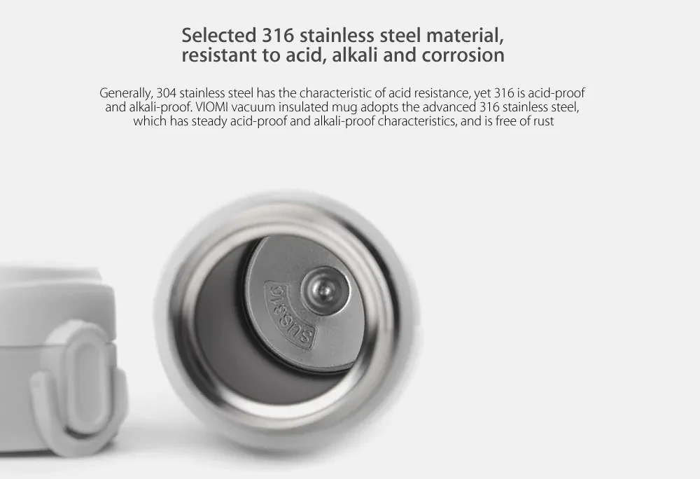 Как правило, нержавеющая сталь 304 имеет свойство к кислотостойкости, но 316 является кислотно-стойким и щелочепроницаемым. Кружка с вакуумной изоляцией VIOMI принимает передовую нержавеющую сталь 316, которая обладает устойчивыми кислотно-стойкими и щелочевыми характеристиками и не содержит ржавчины