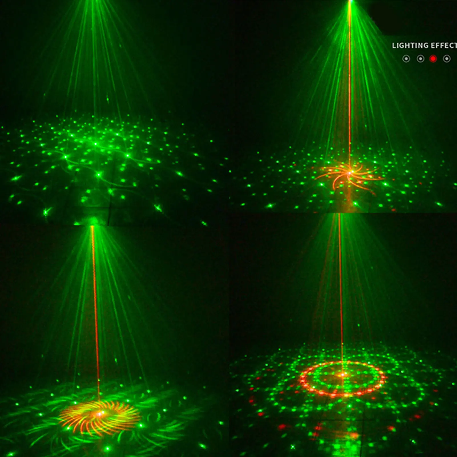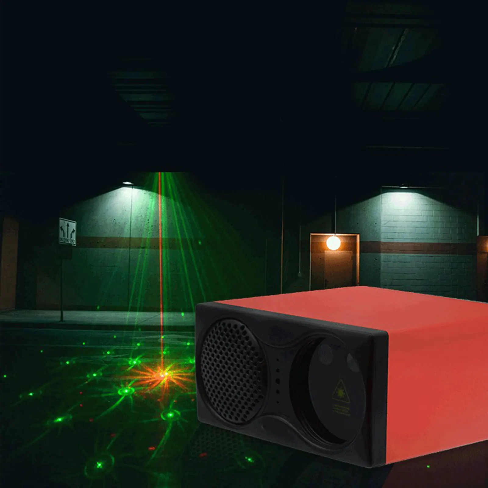 1. Built-in 2200MA large capacity battery, rechargeable.2. With music playback function. The music can be played through Bluetooth connected devices. There is a voice control mode, the lighting effect can change with the music.3. The red and green laser light source can be combined into 48 patterns with cool effects.4. With music, light color red and green, 2 holes emit light, voice control, self-propelled.