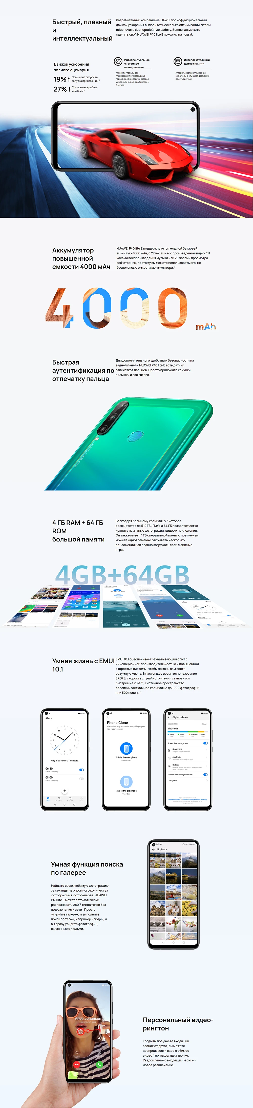 4 Гб RAM + 64 Гб ROM * Из-за ограничений мощности обработки процессора, памяти, используемой операционной системой и предварительно установленными приложениями, фактическое пространство, доступное для пользователей, может быть меньше заявленной емкости памяти. Фактическое пространство памяти может меняться из-за обновления приложений, операций пользователя и других связанных с ними факторов. Внешняя память Поддержка: Карта Micro SD, до 512 ГБ * Продается отдельно