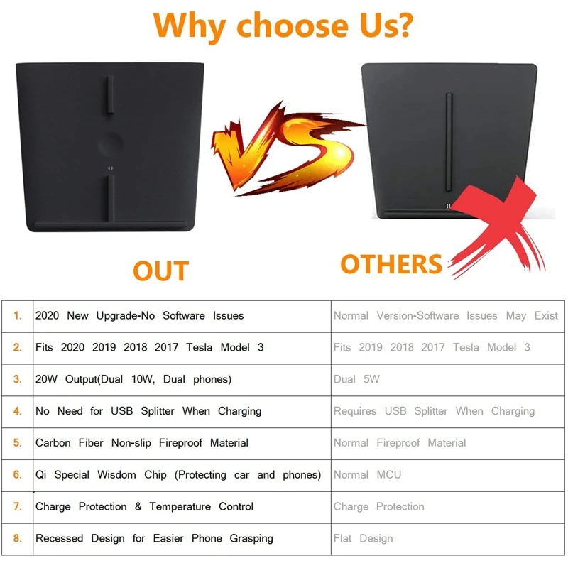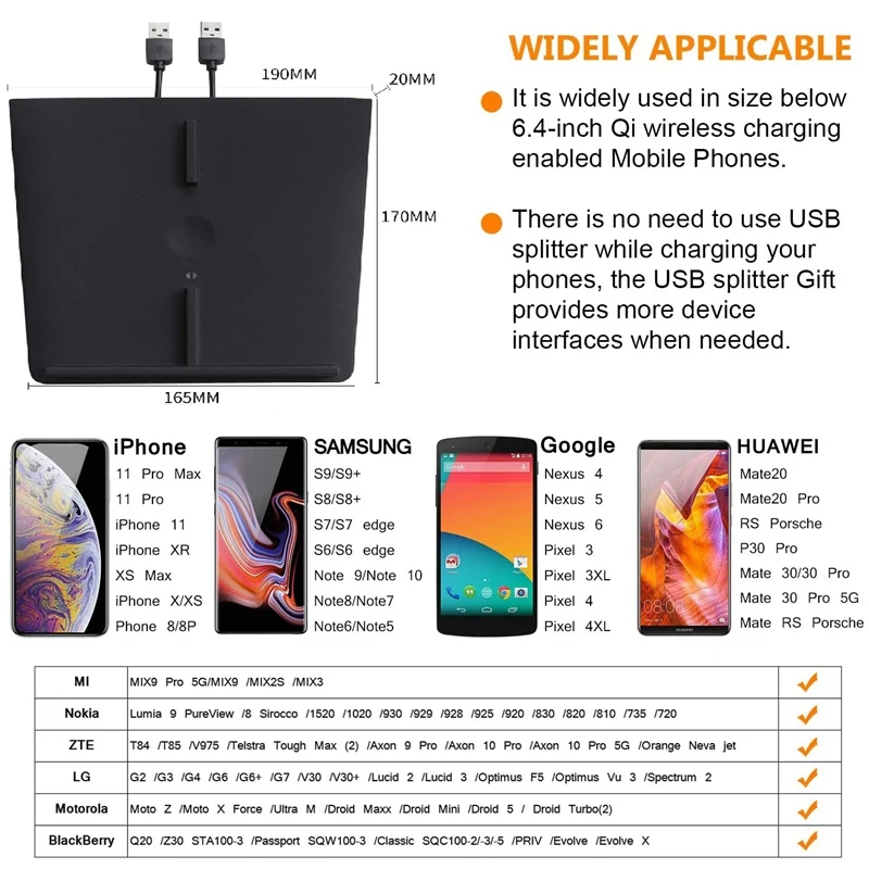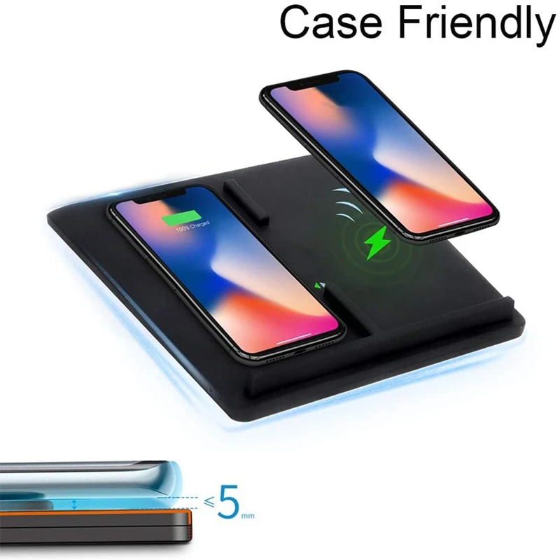 [Двойное Беспроводное зарядное устройство] использование обоих передних портов USB позволяет нам генерировать достаточную мощность, чтобы обеспечить заряд 10 Вт для двух телефонов одновременно.