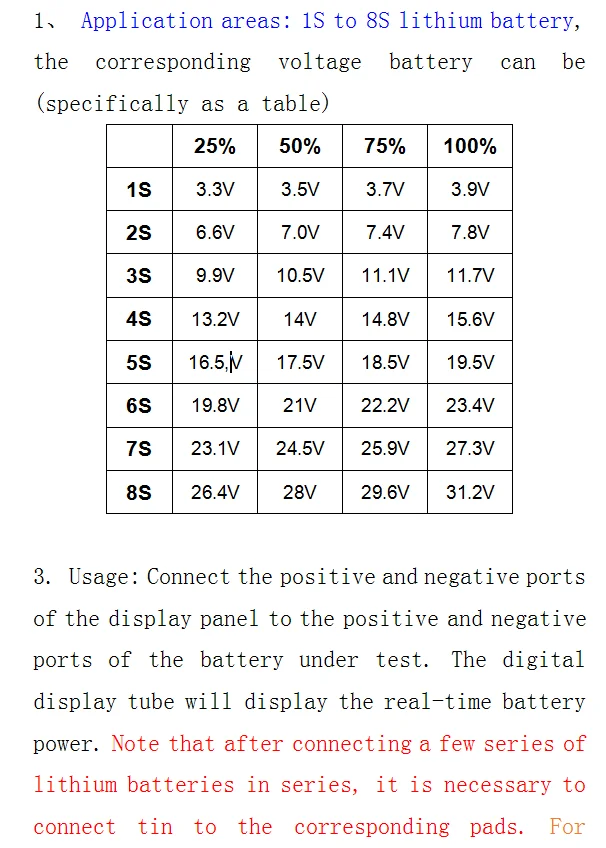 Полезные советы: эта модель не является водонепроницаемой. Если вы используете его на открытом воздухе, пожалуйста, водонепроницаем, потому что электронные компоненты следует использовать в сухой среде. Литий-ионная батарея плата индикатора батареи, которая может использоваться в Ni-MH аккумуляторах, до тех пор, пока требуемое напряжение находится в диапазоне списка параметров. Как использовать: подключите положительный и отрицательный клеммы платы дисплея к положительному и отрицательному клеммам проверяемой батареи. Цифровая трубка отображает заряд батареи в реальном времени.