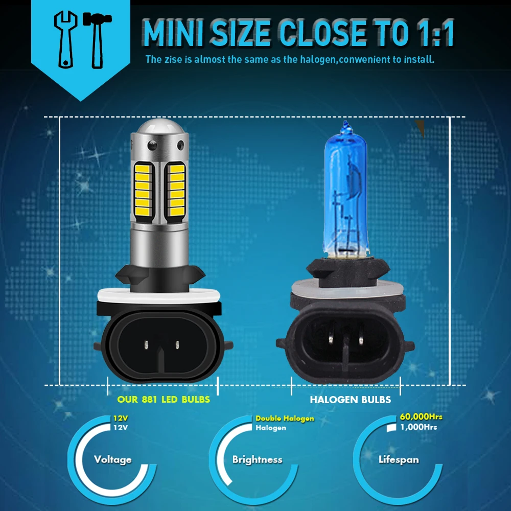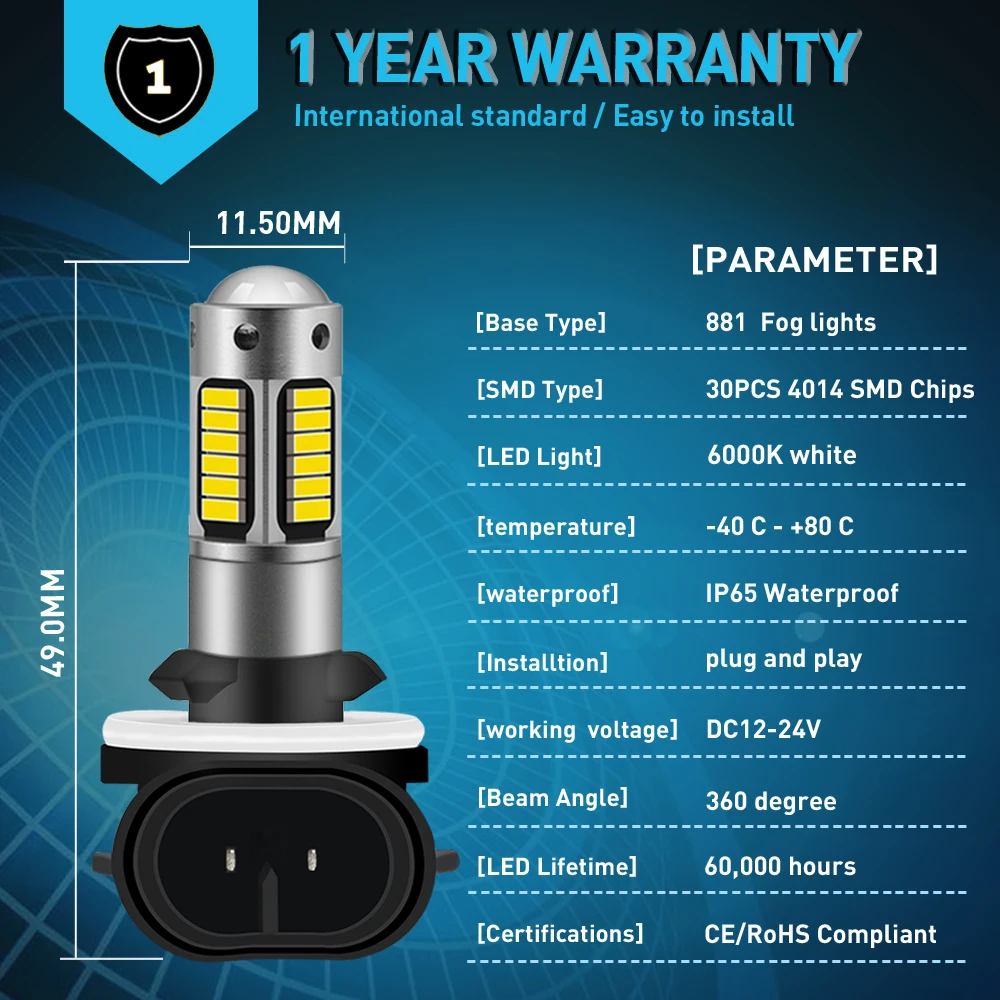 Основной тип: Стандартный 881 / H27 / 880 / H3 / H1 Светодиодный Тип: 4014 чипов, 30 светодиодный Светодиодный Цвет: белый Водонепроницаемость: IP68 Рабочее напряжение: 12 В Материал: алюминий Люмен: 1200 люмен Цветовая температура: 6000K белый Угол луча: 360 градусов Светодиодный срок службы: 60000 часов Тип: светодиодный светильник для замены Список совместимости: 881 / H27 / 880 / H3 / H1 Применение: противотуманные фары, поворотные сигнальные лампы обычно используются, Тормоза, парковка, хвост, DRL и противотуманные фары на автомобиле, Грузовики, внедорожные транспортные средства, фургоны, мотоциклы, скутеры, трейлеры, RVs, Кораблей, морских перевозок и т. Д.