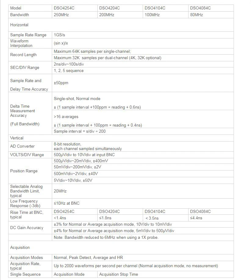 Полоса пропускания 2,80-250 МГц, минимальный Диапазон 500 мкВ/див, частота образцов 1GS/s.