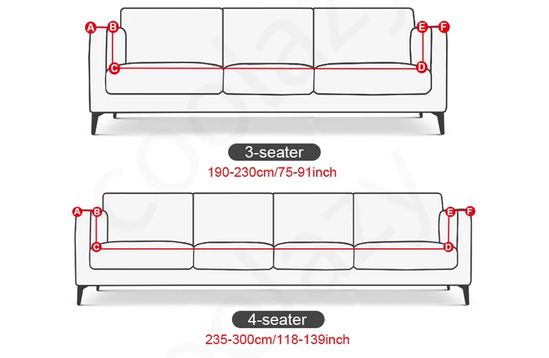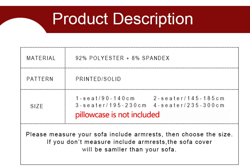 MATERIAL& DESIGN: Polyester and spandex fabric. All rounds without corners wrapped, not easy to wrinkle; elastic band and strap fastening closure at the bottom, double reinforcement, not easy to displacement. FITS MOST FURNITURE: It suits for most types sofa, like fabric sofa, or leather sofa with gap.PLEASE MEASURE BEFORE PURCHASING. 1-seater chair slipcover fits most armchairs up to back length 90 to 140cm/ 35 to 55 Inch. 2-seater loveseat slipcover fits most loveseats up to back length 145 to 185cm/ 57 to 72 Inch. 3-seater sofa slipcover fits most sofas up to back length 190 to 230cm/ 75 to 90 Inch. 4-seater sofa slipcover fits most sofas up to back length 235 to 300cm/ 92 to 118 Inch. STAYS IN PLACE: If your sofa is L type or Corner combined with 2 parts separately, you need to order 2pcs cover for it. This sofa cover applicable to the sofa which there is a deep gap between seat with backrest and armrest. The small cloth strip that you use to hold in place, push them down and under as far as you can, will hold in place. PROTECT: This basic slipcover shields and protects your furniture from spills, stains, wear and tear to prevent it from getting ruined. It is great for homes with pets, or for anyone seeking an economical solution for furniture protection.and spruce up your living room and impress your guests with spending less money. LIGHWEIGHT AND EASY CARE: Easy to set up and pick up; machine wash cold, do not bleach, tumble dry Low, not ironing, installation steps showed by seeing picture. KINDLY NOTE: The side with tag is the back. There are some foam peices or you can prepare something like towels to help tuck the cover into the couch, to make sure our cover will fit your sofa better, please check there are spaces(gaps) on the back and two arms to let the foam strip in, so it can hold the corners and shape the cover, also our cover will fit REGULAR SOFA better.