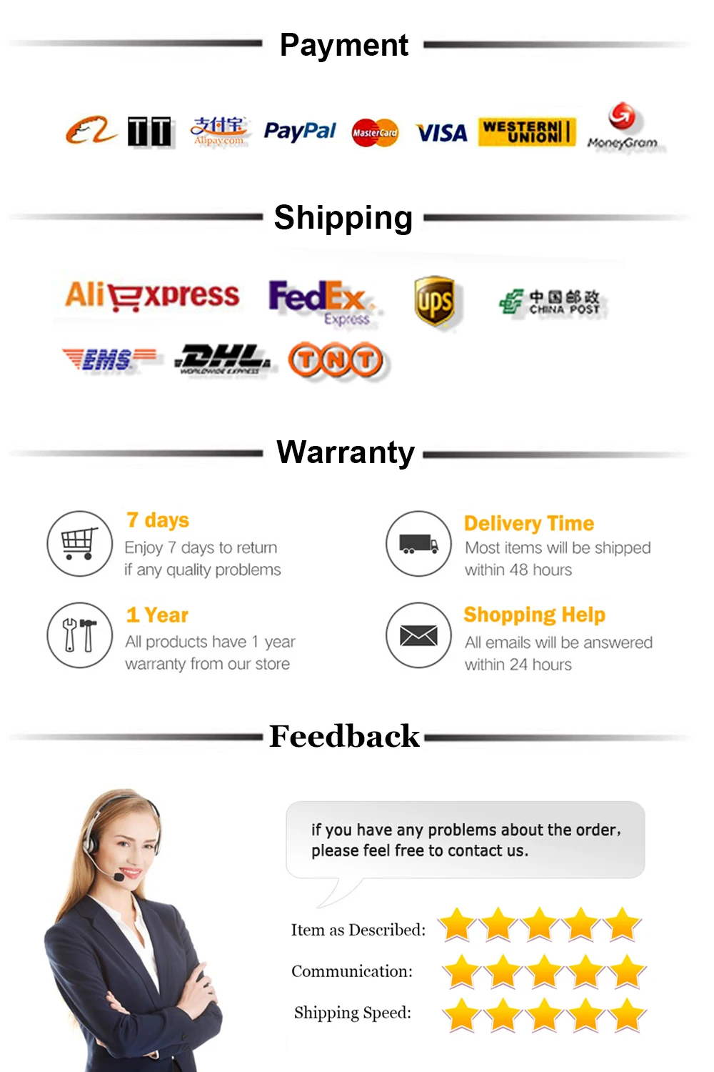 Пожалуйста, свяжитесь с нами, чтобы лучше решить любую проблему, прежде чем оставлять нейтральные или негативные отзывы. Спасибо!