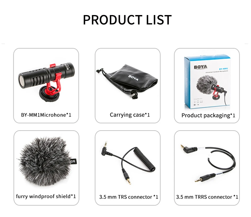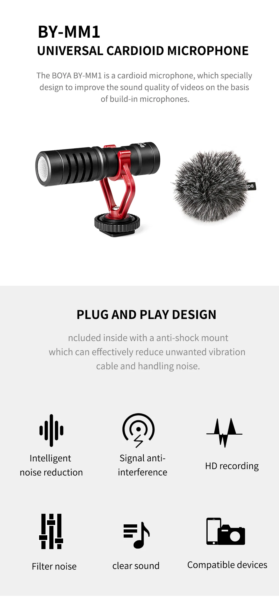 BOYA BY-MM1-это кардиоидный микрофон, который начинает запись специально для улучшения качества звука видео на основе встроенных микрофонов.