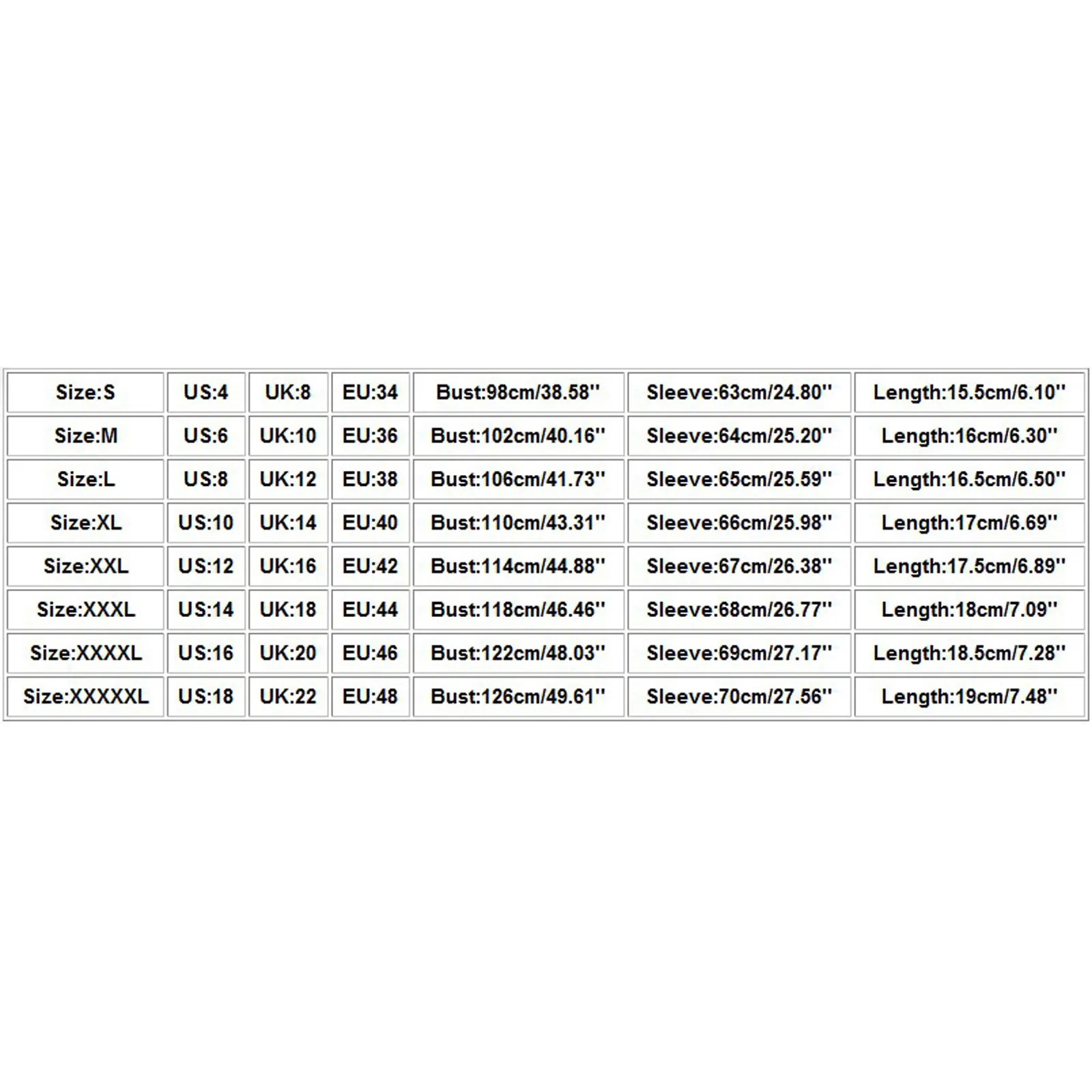 | Размер | США | Великобритания | ЕС | Бюст | Рукав | Длина |