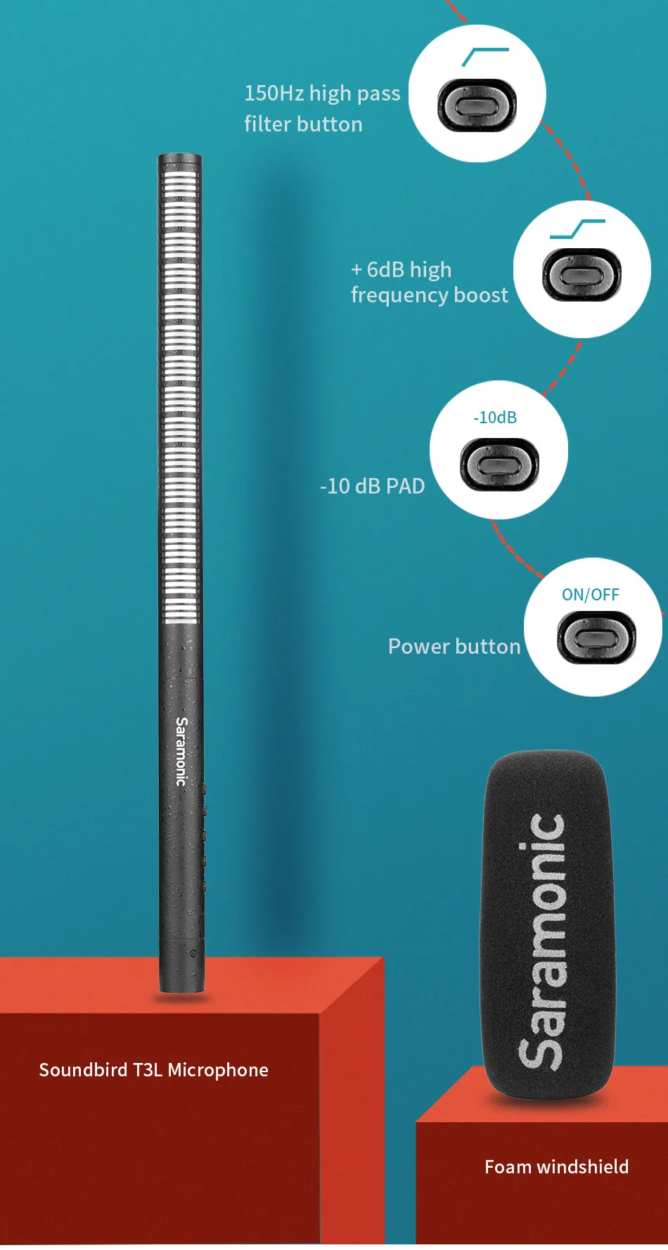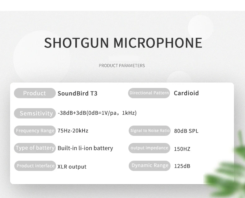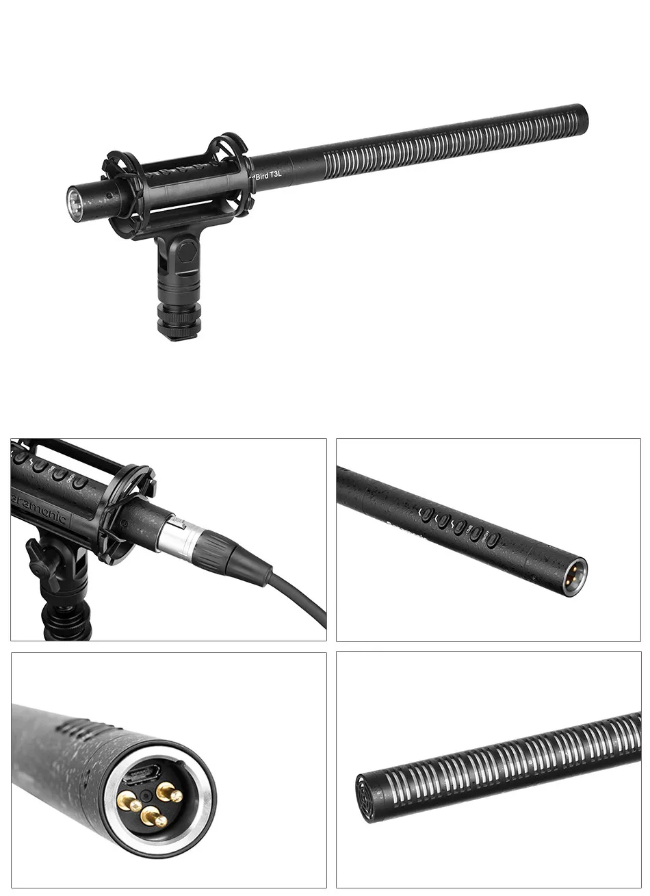Saramonic Soundbird T3-это направленный микрофон из дробовика с кардиоидным полярным узором, встроенной перезаряжаемой батареей, низкочастотным переключателем 150 Гц, высокочастотным повышением + 6 дБ, пусковым устройством-10 дБ и кнопкой питания. Он обеспечивает качество трансляции звука для приложений ENG, filmmaking, field recording, sound design и broadcast.