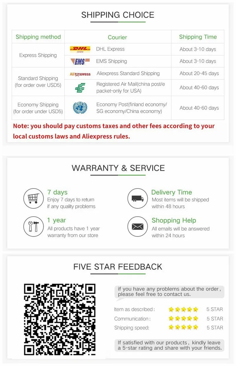 1. Доставка по всему миру. 2. Заказы обрабатываются своевременно после подтверждения оплаты. 3. Мы отправляем только по подтвержденным адресам заказа. Ваш адрес заказа должен совпадать с вашим адресом доставки. 4. Представленные изображения не являются фактическим товаром и предназначены только для справки. 5. Из-за наличия на складе и разницы во времени, мы выберем доставку Вашего товара с нашего первого доступного склада для быстрой доставки.