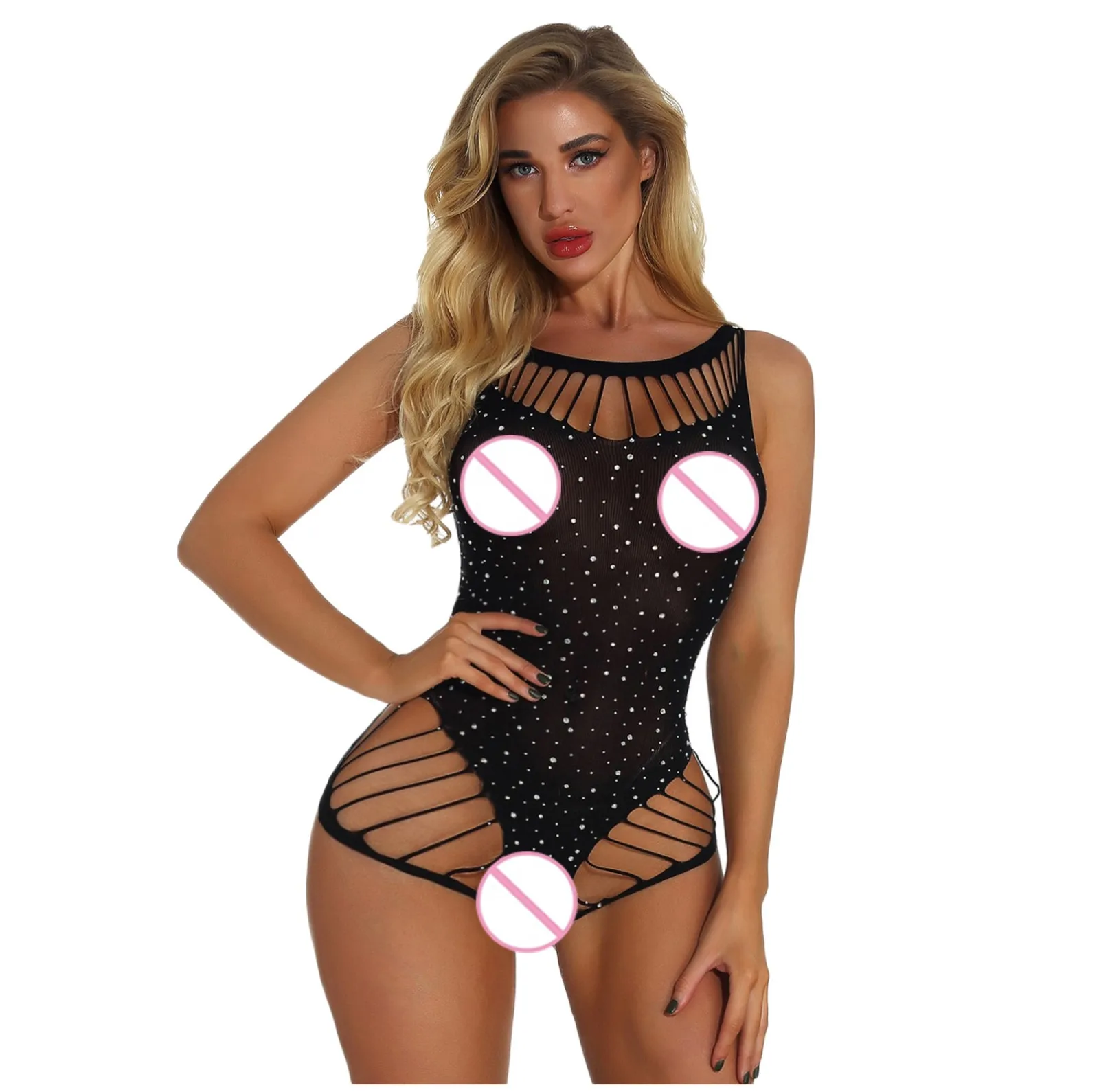 Пикантные сетчатые кружевные Для женщин прозрачные стразы Топ ажурные сексуальное белье, боди-комбинезон, комбинезон