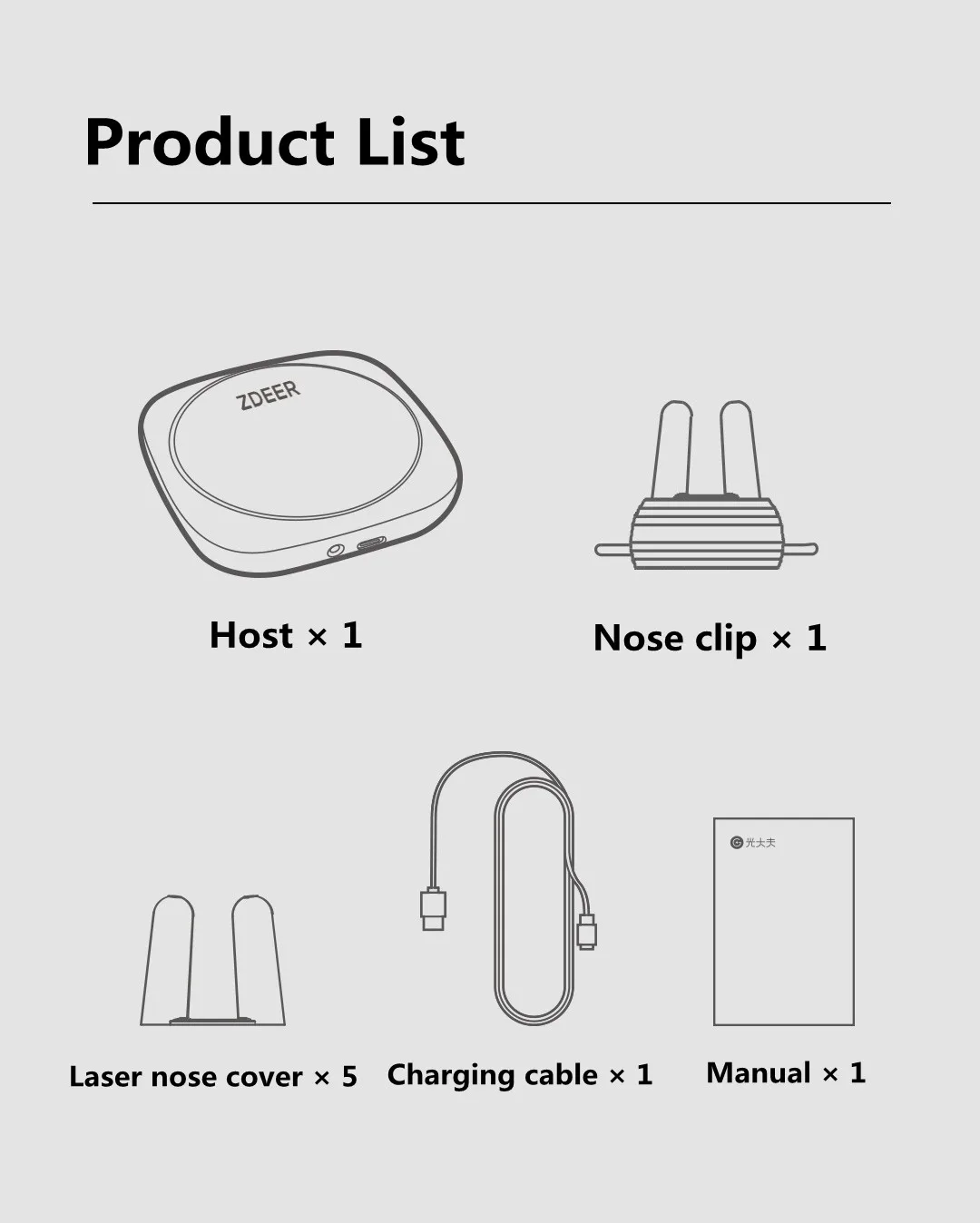 1 хост, 1 зажим для носа, 1 usb-кабель для зарядки, 1 руководство, 5 Крышка с носиком