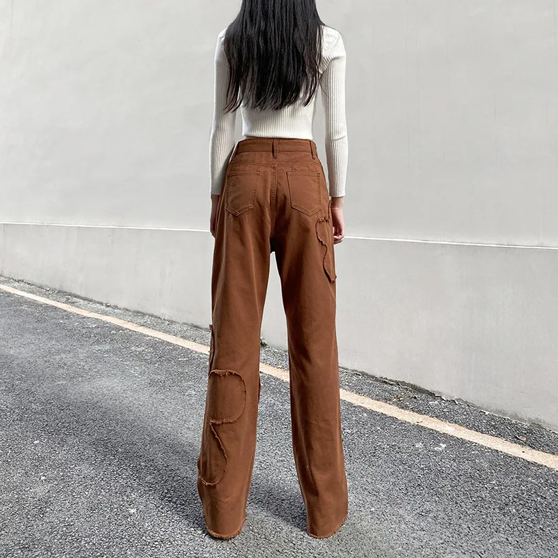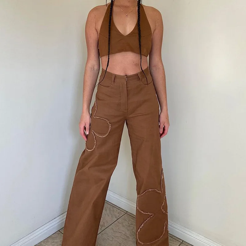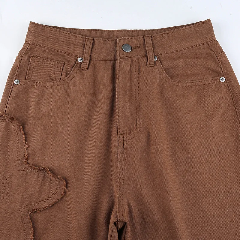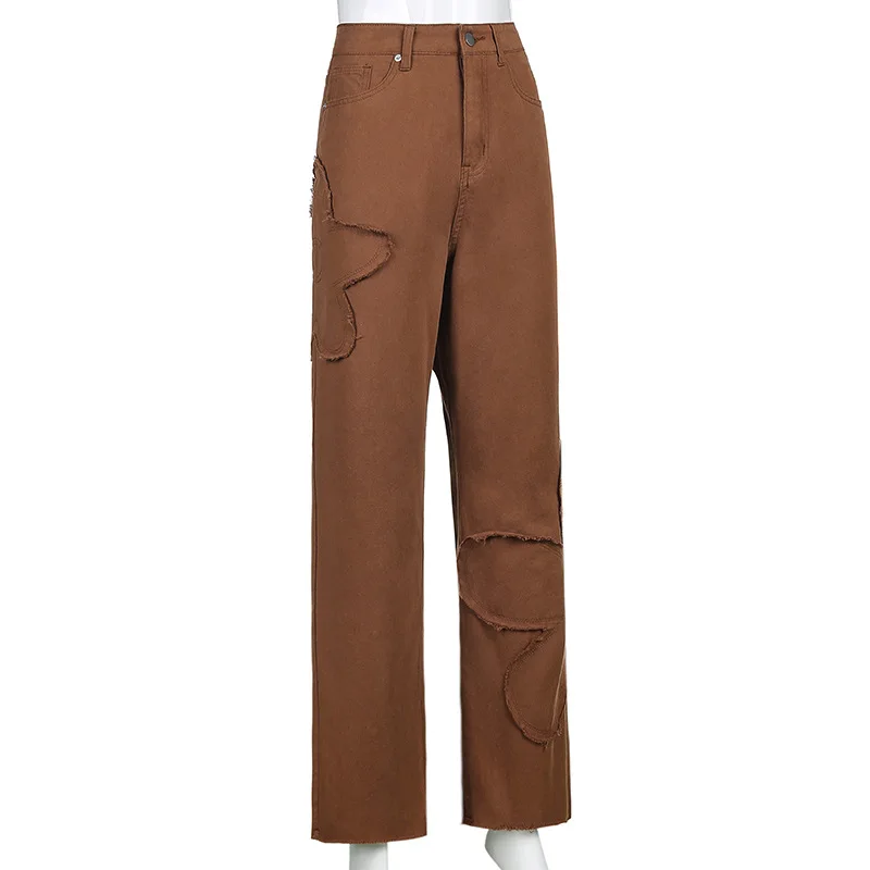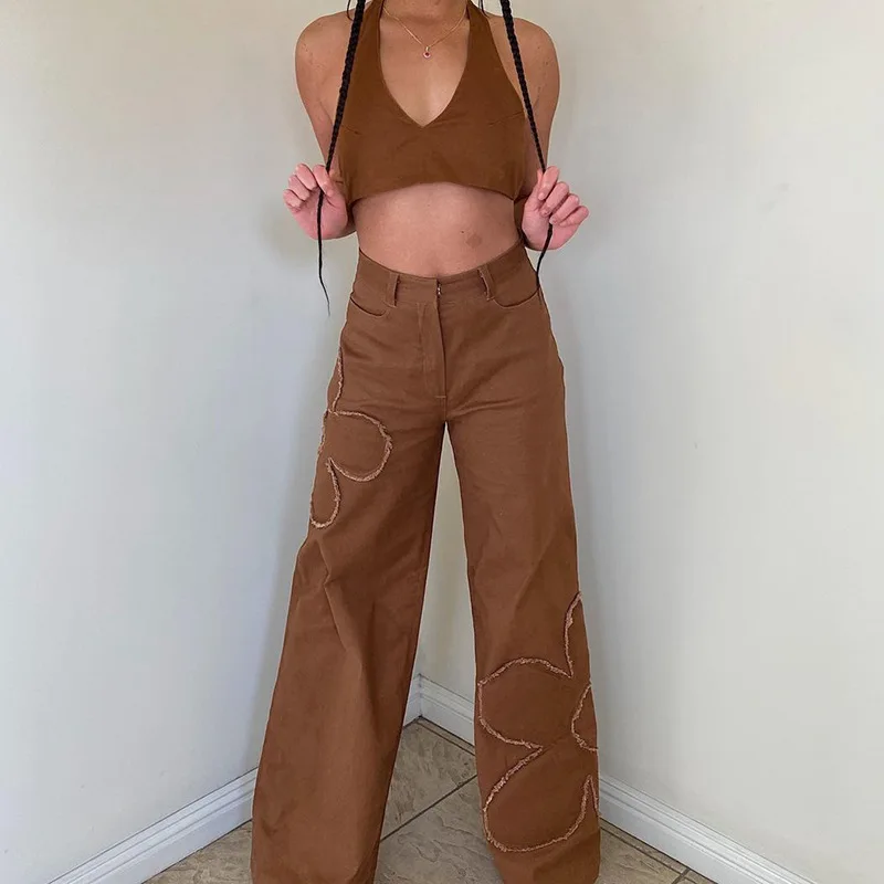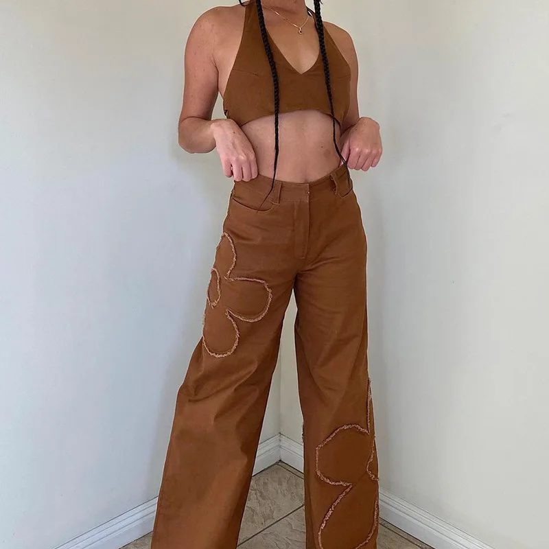 Y2K уличные брюки карго для женщин 90s коричневый винтажный цветочный принт сплайсинга свободные средняя талия Harajuku модные прямые джинсовые брюки