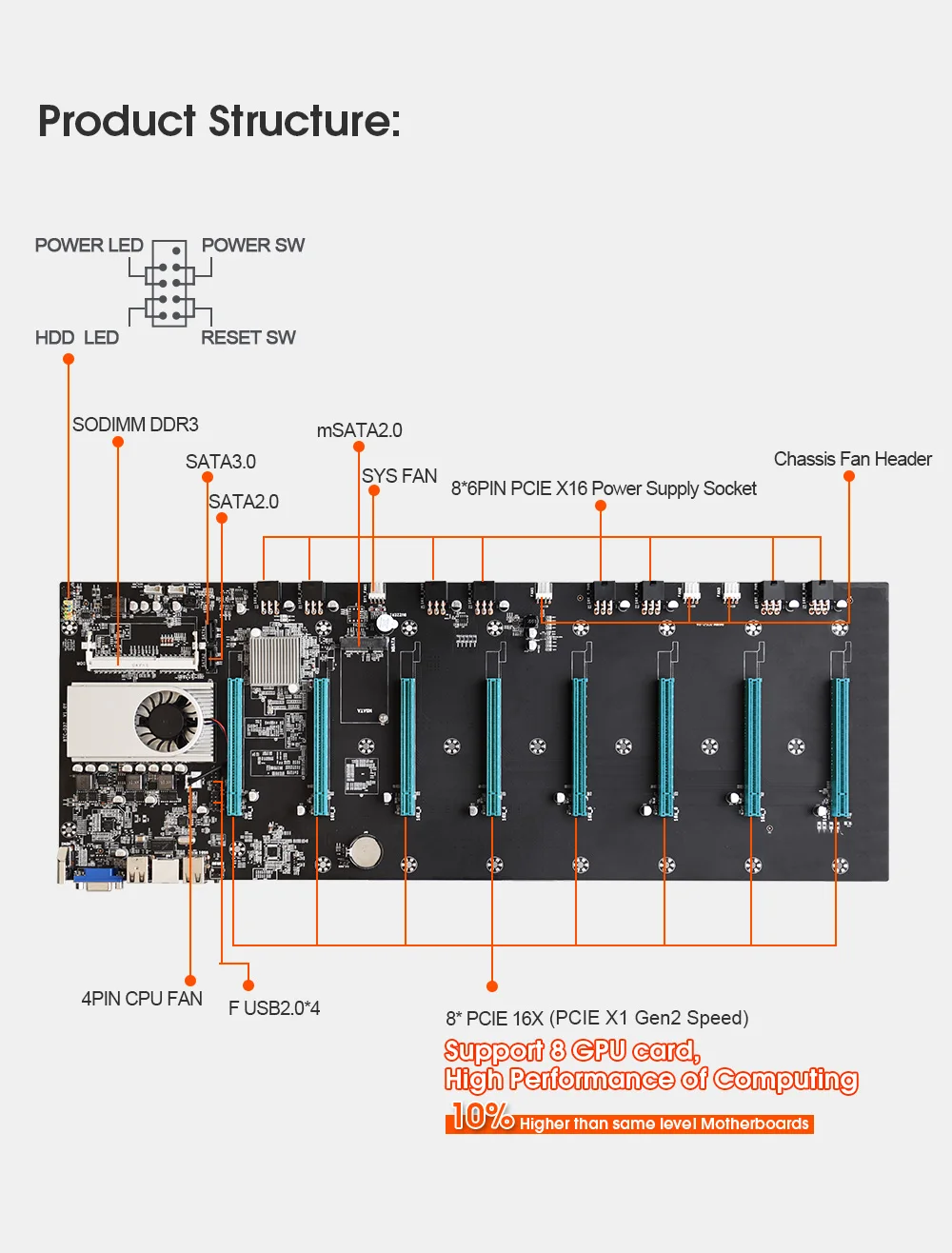 Расширяемый порт: 8 * PCIE 16X,8*6pin PCIE X16 разъем питания, HDMI-совместимый + VGA