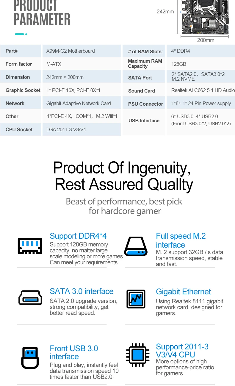 Часть # SZMZ X99M-G2 Чип Intel Полноразмерный процессор LGA 2011-V3 4 * слот DDR4 RAM, поддержка двухканальной архитектуры до 64 ГБ 1 * S/PDIF заголовок Бортовой высокоскоростной WiFI-M.2 интерфейс + интерфейс NVMe M.2 ЦП поддерживает полную серию LGA 2011-V3 серии Форм-фактор M-ATX, 242 мм x 200 мм Память 4 * слот DDR4 Максимальная емкость оперативной памяти 64 ГБ Графический 1 * PCI-E 4X 1 * PCI-E 16X Хранение 2 * SATA3.0 2 * SATA2.0 LAN Realtek RTL8111H чипсет, настраиваемый гигабитный Ethernet Аудио Realtek аудио кодек ALC662, 5,1 звуковой канал поддерживается. USB порты 6 * USB3.0, 4 * USB2.0 Блок питания 1*8 Pin + 1*24 Pin Другой бортовой высокоскоростной интерфейс NVMe M.2 + интерфейс WiFI-M.2 Аксессуары 1 x I/O щит 1 x SATA кабель