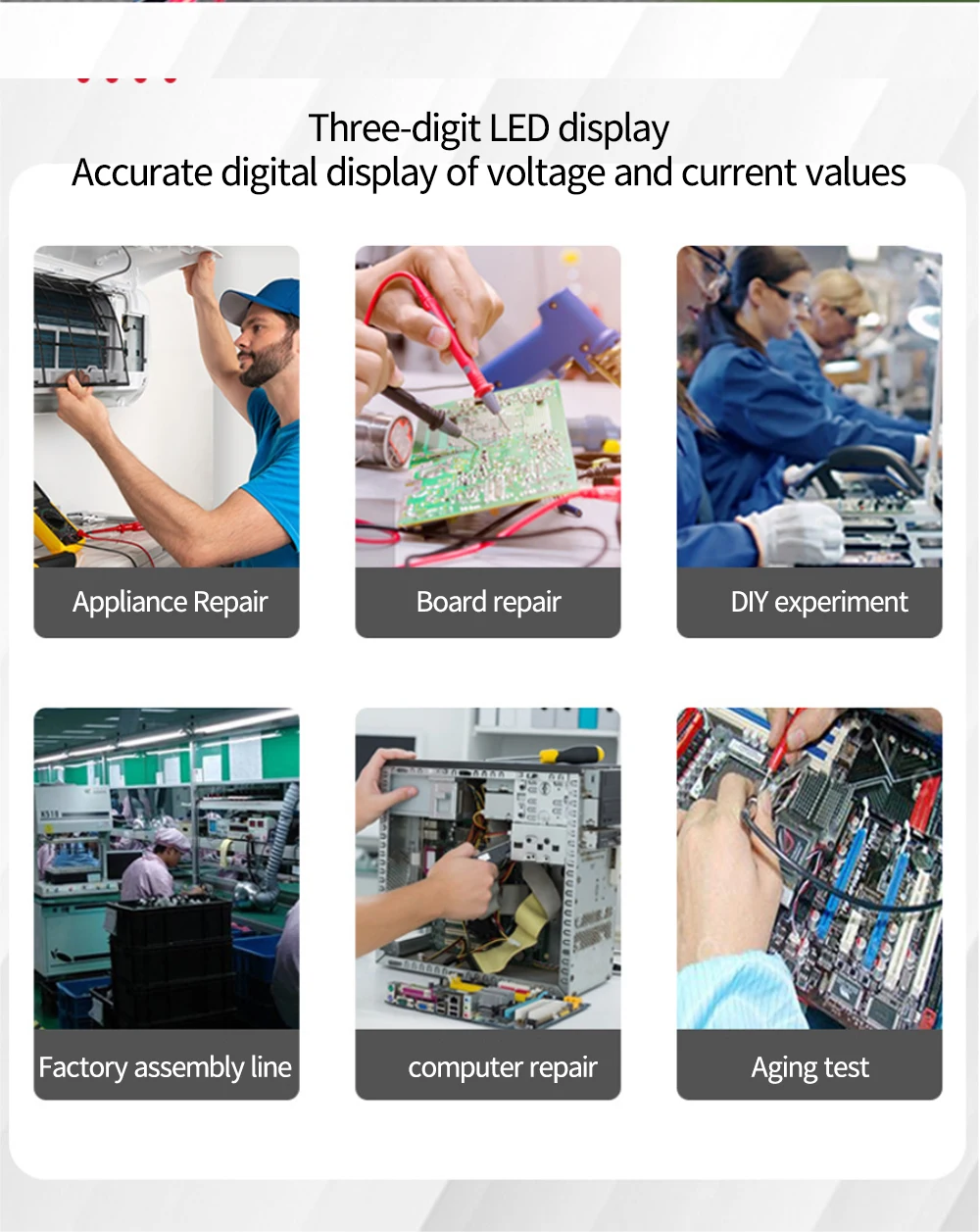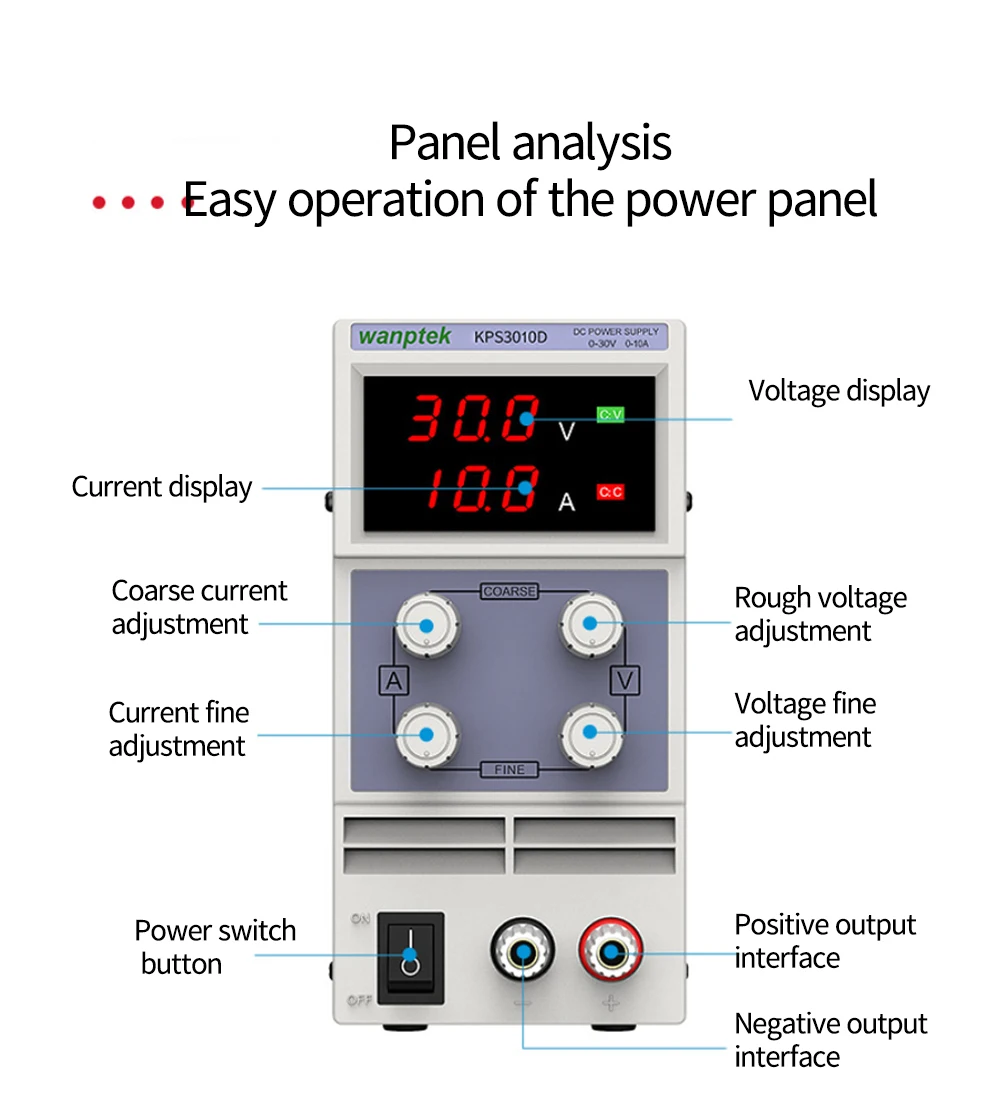 ОписаниеСерия KPS представляет собой один набор выходов, высокоточный двойной дисплей переключатель питания постоянного тока. Машины имеют полную функцию защиты от эксплуатации, с высокой производительностью, низкой пульсацией, высокой стабильностью, весом и малым объемом светильник и т. д. Защита от ограничения тока, может сделать KPS источник питания и нагрузку от случайного повреждения. Блок питания серии KPS с низкой схемой контроля температуры, Шум охлаждающего вентилятора низкий. (включите переключатель, вентилятор не может работать. Вентилятор должен работать до температуры)Специальная точка1. Имеет полную функцию операционной защиты2, высокоэффективный, низкая пульсация, малый объем, светильник3, двойной дисплей напряжения, тока и высокой точности4. Стабилизация напряжения, ограничение тока, простая работа5, Двойной вход напряжения и удобный выбор6, вентилятор контроля температуры, рассеивание тепла, низкий уровень шума7, двойной потенциометр более точная регулировкаТехнические индикаторыВход напряжение: AC 110V/220V/50/60HzВыходное напряжение: 0 - 30 вВыходной ток: 0 - 10AНапряжение Разрешение: 0,1 VТекущее Разрешение: 0.01AЭффект питания: CV≤ 1% + 10 мВЭффект нагрузки: CV≤ 1% + 10 мВПульсация и шум: Vp-p≤ 1%Точность отображения напряжения: ± 1% + 1 цифраТочность отображения тока: ± 1% + 2 знакаВес нетто/брутто (кг): 2,0Объем (мм):81WX165HX220LРабочая среда:(-10-45) Rh<90%Время работы: долгое времяБанановый зонд с 4 мм штабелируемыми банановыми пробками изготовлены из латуни и никеля. Заглушки также имеют мобильные мульти дамские Пружинные контактные ячейки для плотной посадки.Пожалуйста, оставьте массаж, который (EU/US/AU/UK) вам нужен!