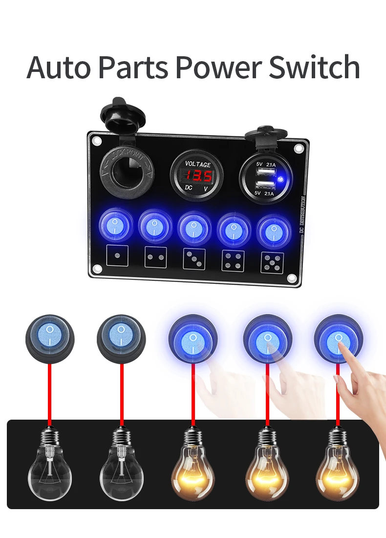 ★5 банд кулисный переключатель панель может управлять 5 шт. электроприборов в то же время, подходит для всех 12 В/24 В систем, таких как автомобиль, автобус, грузовик, яхта, караван, лодка, и т. Д.