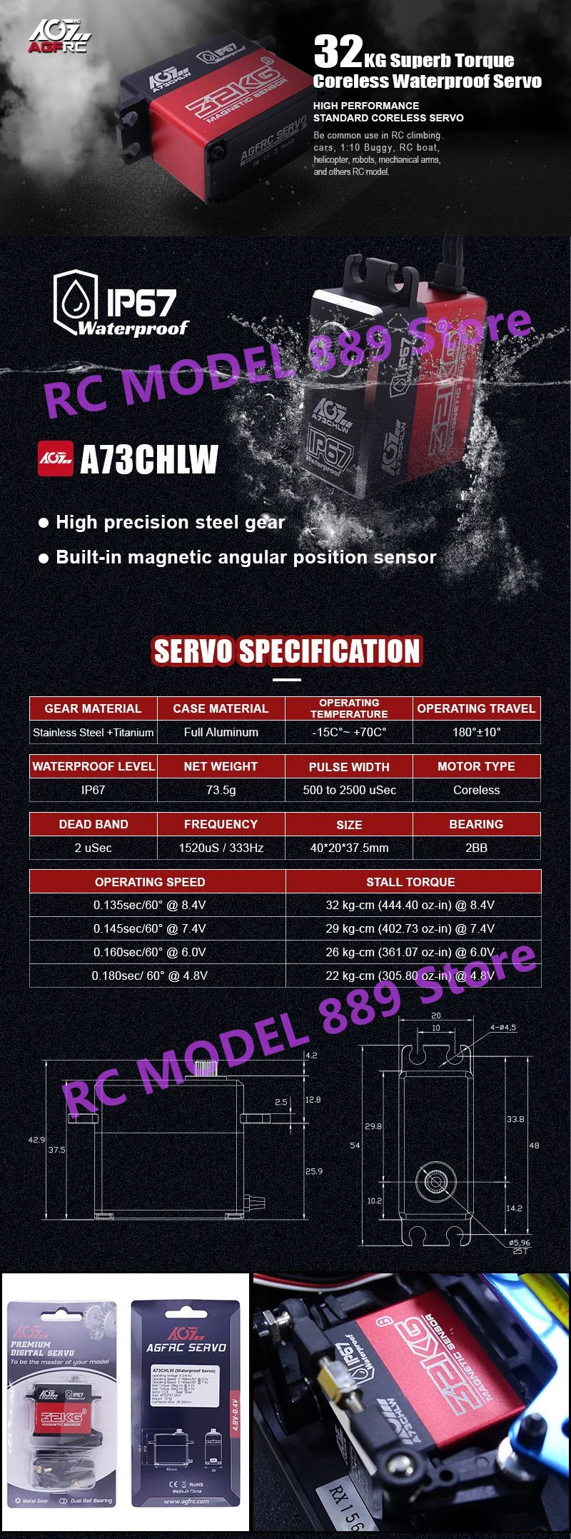 Характеристика Высококачественный стандартный цифровой сервопривод Высокоточный магнитный датчик углового положения Полностью водонепроницаемый класс до IP67 Надежные металлические шестерни Высокоэффективный Бессердечный мотор Высокопрочные двойные шариковые подшипники Алюминиевый чехол с быстрым охлаждением Идеально подходит для 1/10 Rock Crawlers, Monster Trucks, самолета, вертолета и двигателя и т. Д. Спецификация A73CHLW Операционной Напряжение: 4,8-8,4 V Рабочая скорость: 0.160 сек/60 ° @ 6,0 В Рабочая скорость: 0. 145сек/60 ° @ 7,4 В Рабочая скорость: 0. 135сек/60 ° @ 8,4 в Крутящий момент: 26 кг-см (361,07 унций-in) @ 6,0 В Крутящий момент: 29 кг-см (402,73 oz-in) @ 7,4 V Крутящий момент: 32 кг-см (444,40 oz-in) @ 8,4 V Шестерня: сталь Двигатель: без косточек Размеры: 40*20*37,5 мм (1,57x0,78x1,47 дюйма) Вес: 73,5 г Соединительный провод: JR 300 мм