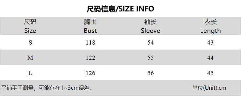 Таблица размеров (см/дюйм): Размер (см) S Обхват груди: 118 рукав: 54 длина: 43