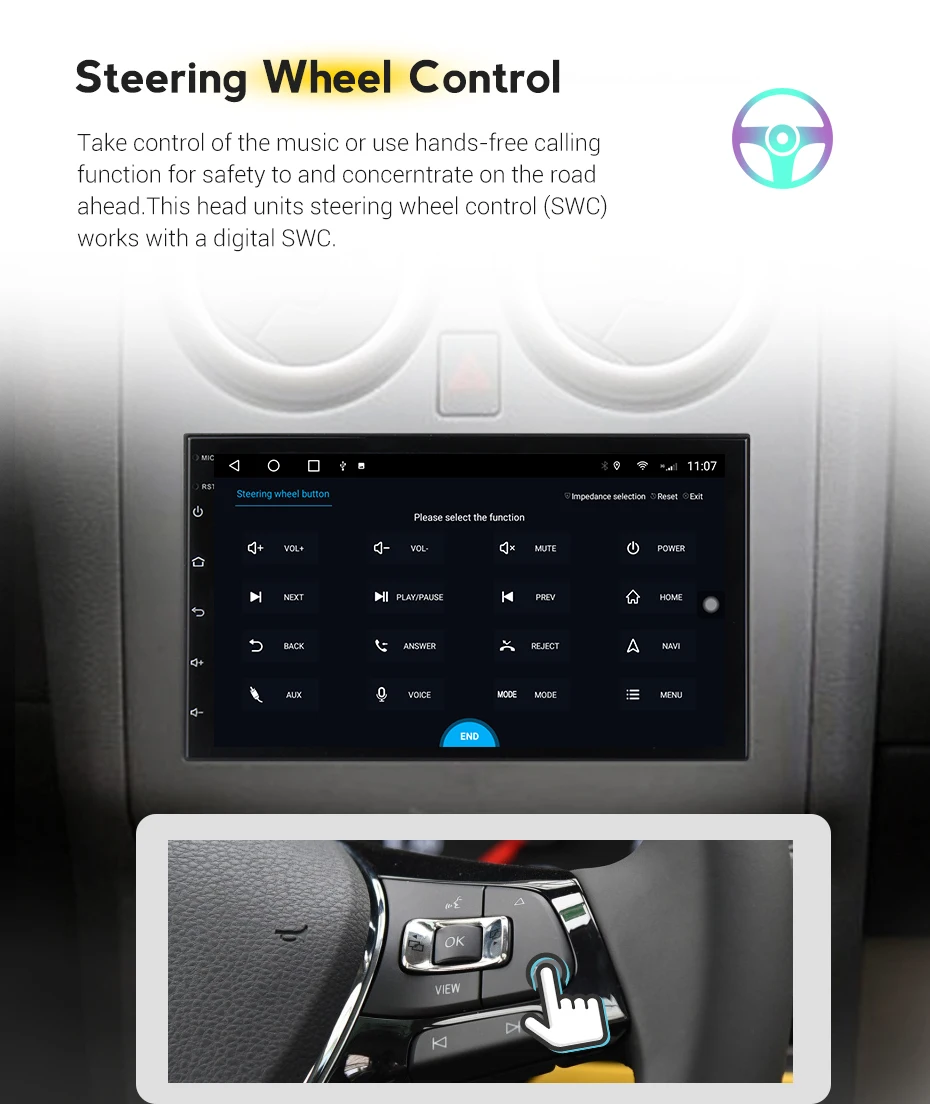 > Поддержка оригинального и внешнего управления кнопками рулевого колеса.