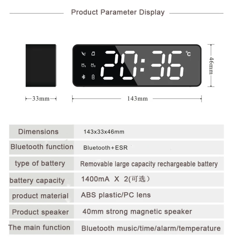 Основные функции: Bluetooth Музыка/получение трансляции/Отображение времени/напоминание о тревоге/Отображение температуры