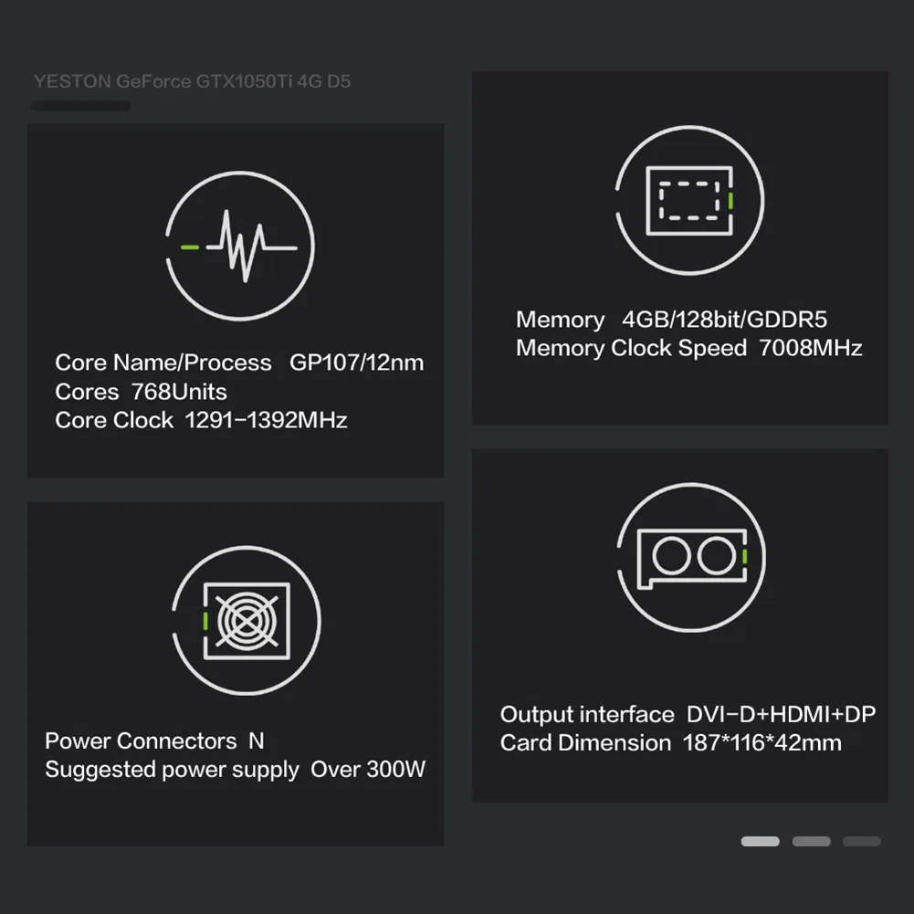 ![]() Видеокарта GTX-1050-Ti дюйма, 4 Гб, GDDR5, 128 бит, PCI-Express, игровая видеокарта GPU для компьютера с Windows 10, 8, 7 ПК Спецификация: Основной код и процесс: GP107/14nm Единый шейдер: 768 Частота ядра: 1291/1392 МГц Частота видеопамяти: 7008 МГц Объем и характеристики памяти: 4 ГБ/128 бит/GDDR5 3D характеристики: для DirectX 12/для DSR/для GameStream/для G-Sync/для OpenGL 4,5/8K ОС: для Windows 7/8/10 Кулер: Y110A Другие характеристики: GPU Boost 2,0 Шина интерфейс: PCI-Express 3,0x16 Выходной интерфейс: DVI-D + HDMI-совместимый + DP Конструкция источника питания: 2 + 1 фазовая цепь Размер видеокарты: 187*116*42 мм/7,36*4,57*1,65" Вес видеокарты: 359 г Размер упаковки: 360*210*80 мм/14,2*8,27*3,15" Вес брутто: 580 г Примечание: Возможны незначительные отклонения в размерах из-за ручного измерения, различных методов измерения и инструментов. Изображение может не отражать фактический цвет изделия из-за различий светильник, угле и мониторе дисплея. ![]() 1 X видеокарта 1 Руководство пользователя ![]() ![]() ![]() ![]() ![]() ![]() ![]() ![]() ![]() ![]() ![]() ![]() |