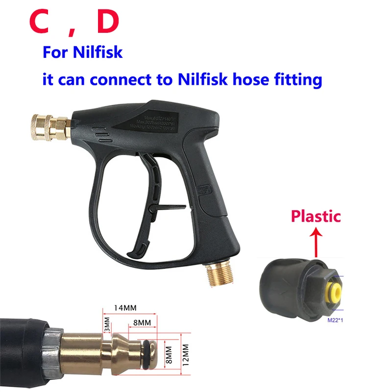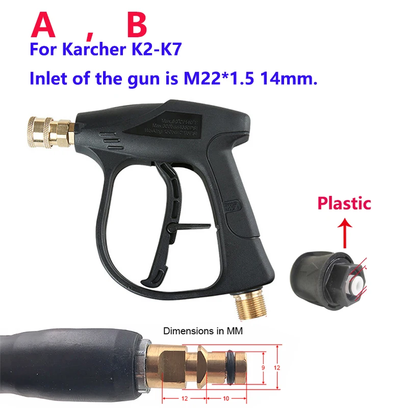 * Поставляется с 4 различными взаимозаменяемыми соплами, 0 °, 15 °, 25 °, 40 ° и 60 ° градусов размеры * латунный быстроразъемный разъем для быстрого обмена сопло * пистолет Номинальный вверх До 280 бар-4000 фунтов на квадратный дюйм, максимальный поток 25 л/м, максимальная температура 150 градусов * блокировка пускового механизма * M22 Штекерный разъем поставляется в качестве стандарта-подходит прямо к вашей мойке давления M22 Шланг