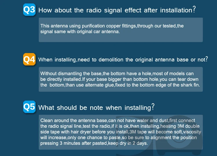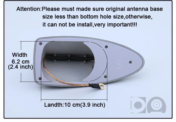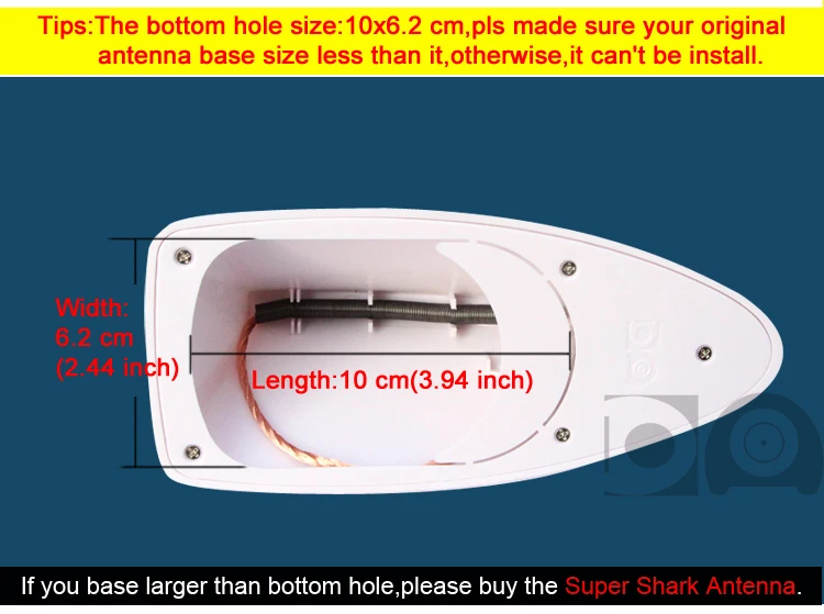 1, размер нижнего отверстия 10x6,2 см, пожалуйста, убедитесь, что ваше оригинальное основание антенны меньше, в противном случае, его нельзя установить. Пожалуйста, купите антенну Super shark, она подходит для большего основания. 2. Пожалуйста, выберите цвет, близкий к вашему цвету автомобиля, если вы не уверены, пожалуйста, свяжитесь с нами перед заказом.