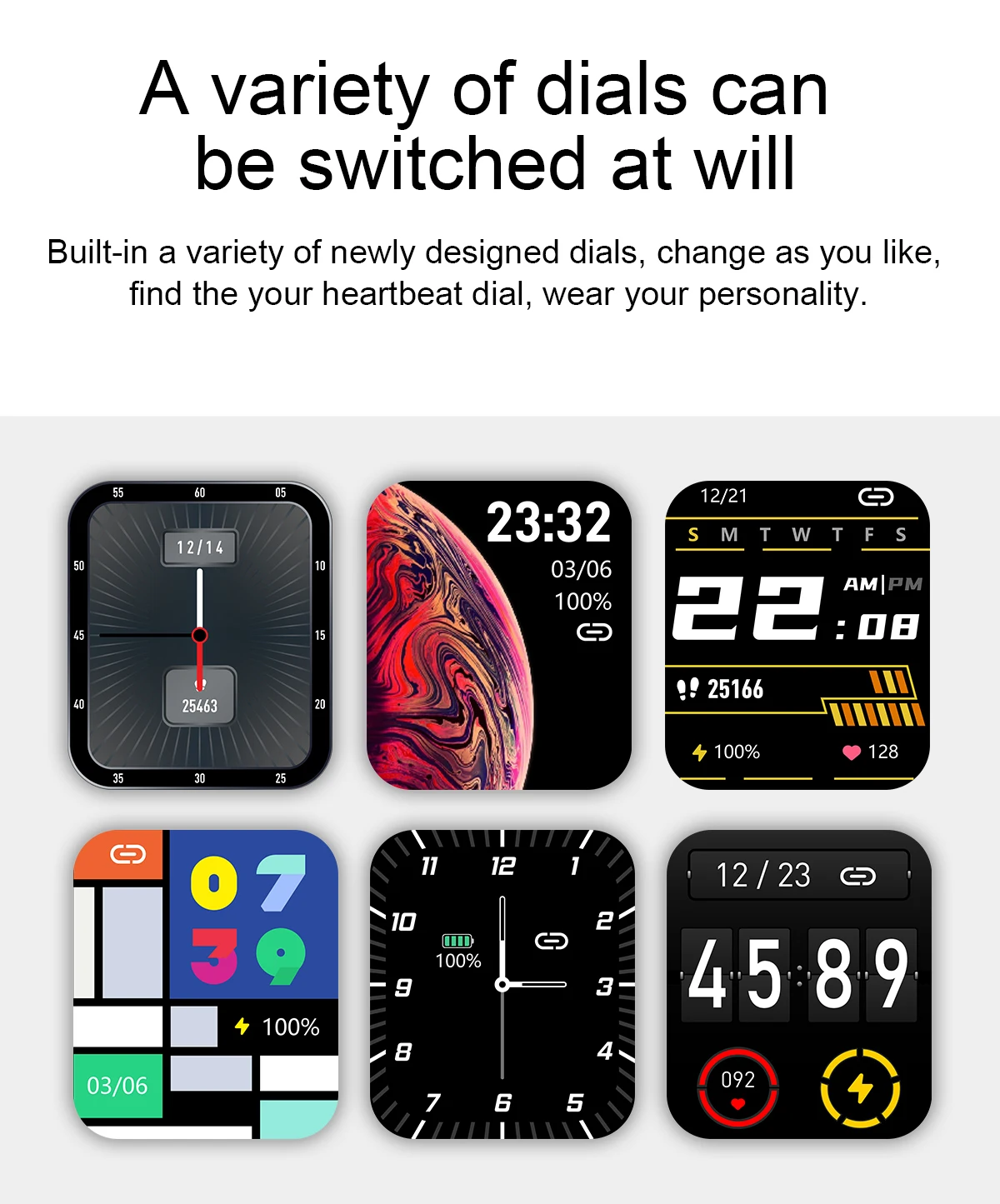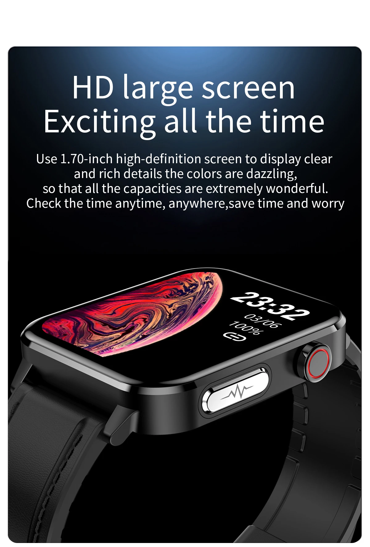 Размер экрана: 1,70 дюйма цветной экран HD TFT 240*280 BLuetooth: 4,2 (низкая мощность) Емкость аккумулятора: 200 мАч Тип зарядки: магнитное притяжение время выдержки: около 7 дней, около 30 дней в режиме ожидания Корпус: металлический сплав + нижняя часть из нержавеющей стали: PC + ABS + медицинский стальной лист 316