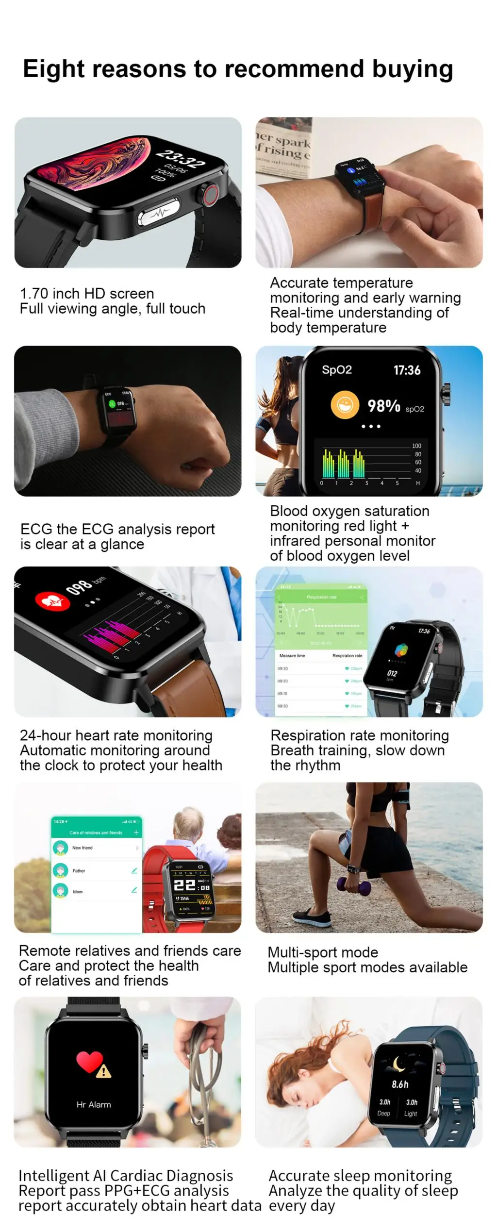 Функция электрокардиограммы, медицинская диагностика AI, мониторинг температуры, мониторинг оксигемоглобина, частота дыхания. Функция упражнений: количество шагов/калорий/расстояние, несколько режимов движения. Мониторинг сердечного ритма, мониторинг артериального давления и другие функции здравоохранения удаленные функции по уходу за близкими и друзьями