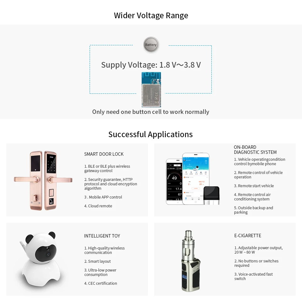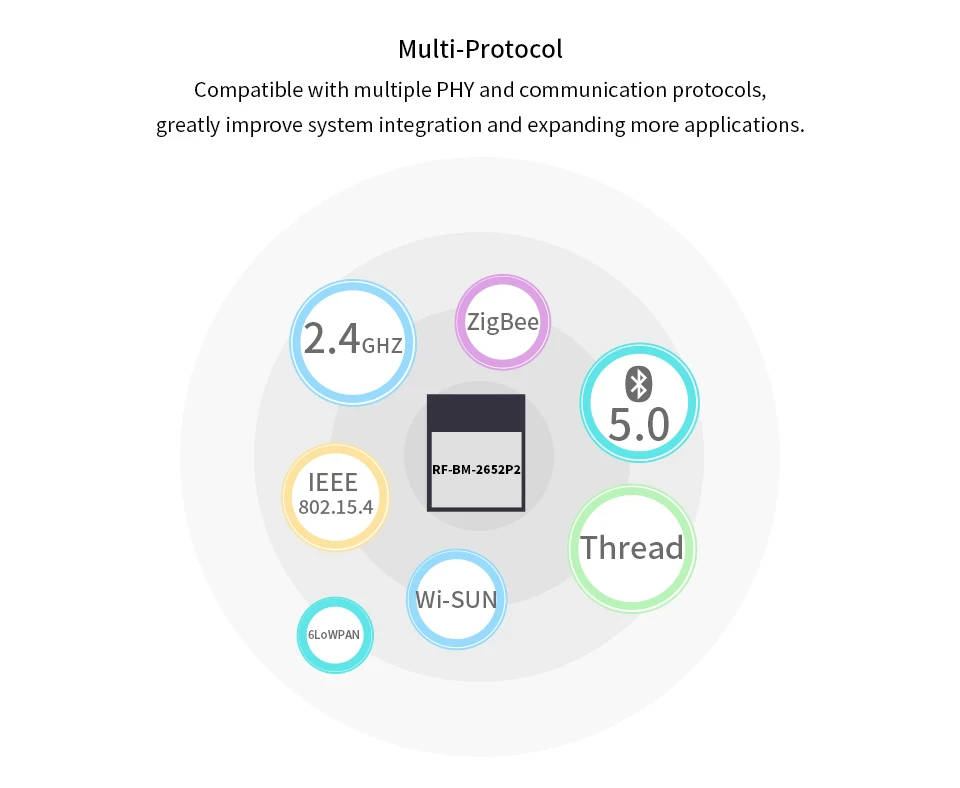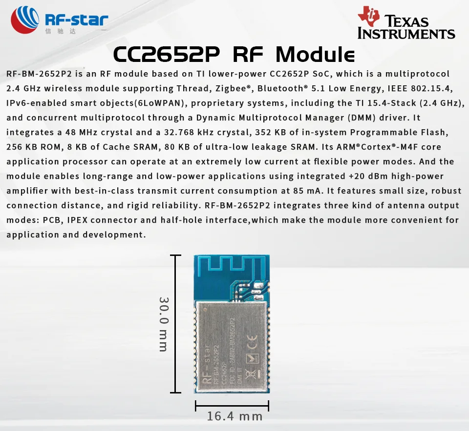 RF-BM-2652P2-это радиочастотный модуль, основанный на TI lower-power CC2652P SoC, который является многопротоколом 2,4 ГГц беспроводным модулем, поддерживающим резьбу, Zigbee®, Bluetooth®5,1 с низким потреблением энергии, IEEE 802.15.4, IPv6-enabled смарт-объектов (6lowpan), закрытые системы, в том числе TI 15,4-стека (2,4 ГГц), и одновременно multiprotocol с помощью динамической Multiprotocol Manager (DMM) драйвер. Он интегрирует Кристалл 48 МГц и кристалл 32,768 кГц, программируемая флеш-память в системе 352 КБ, 256 Кб ROM, 8 Кб кэша SRAM, 80 КБ сверхнизкой утечки SRAM. Его рука®Кортекс®-Процессор M4F core appliance может работать при чрезвычайно низком токе при гибком режиме питания. И модуль обеспечивает применение с большой дальностью и низкой мощностью с помощью интегрированного + 20 дБм высокомощного усилителя с лучшим в своем классе потреблением тока при 85 мА. Он имеет небольшой размер, надежное Расстояние соединения и твердую надежность. RF-BM-2652P2 интегрирует три вида режимов выхода антенны: PCB, IPEX Разъем и полуотверстие интерфейса, что делает модуль более удобным для применения и разработки.