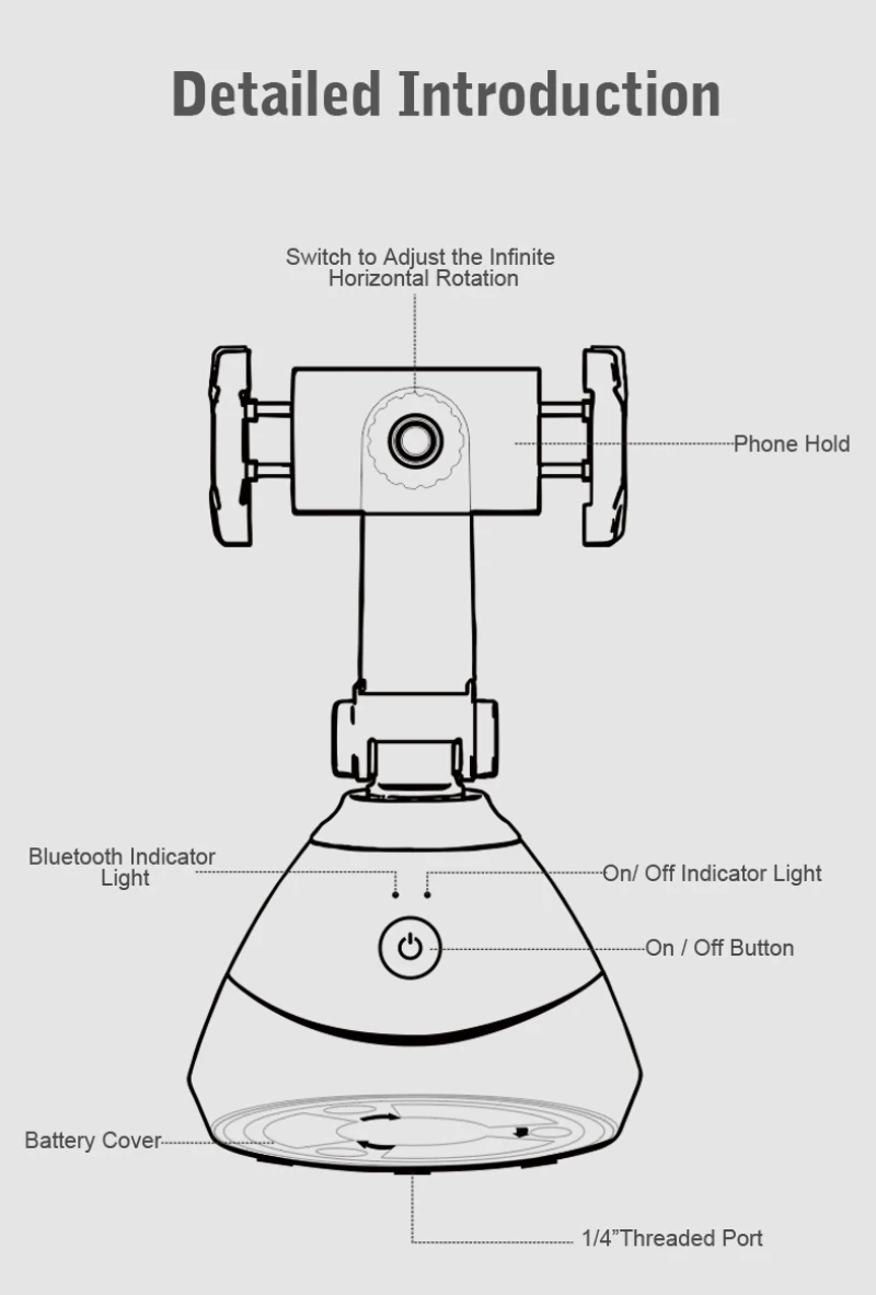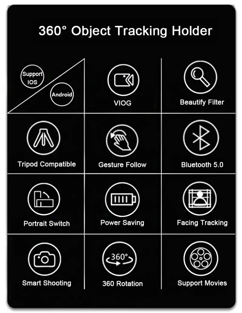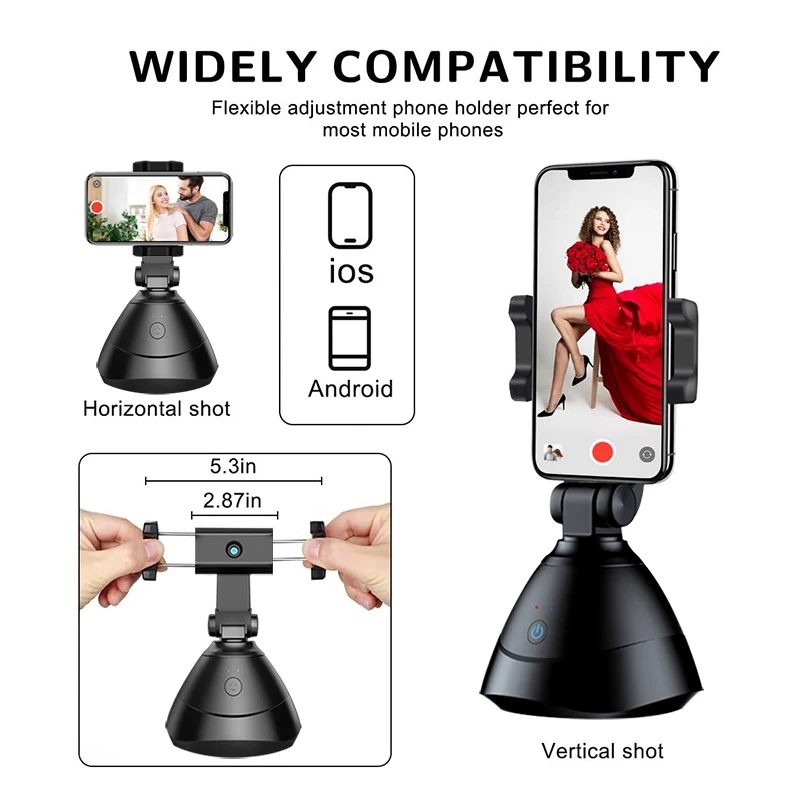 -Усовершенствованный дизайн: Эта смарт-камера для отслеживания объекта была модернизирована как в программном, так и в аппаратном обеспечении, в сочетании с супер низкой мощностью Bluetooth 5,0 чип, сменный дизайн батареи, легко удовлетворить ежедневные потребности в съемке. Держатель телефона изготовлен из мягкого силикона, который поддерживает мобильные телефоны размером 56-100 мм.