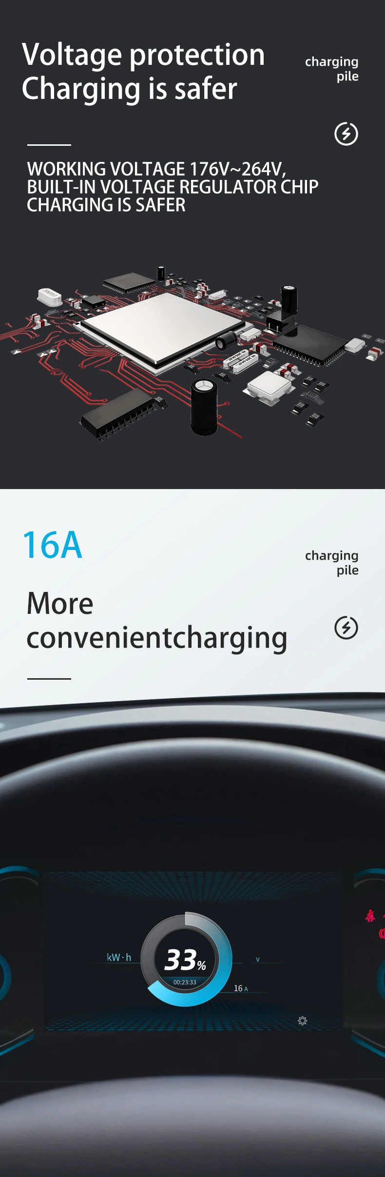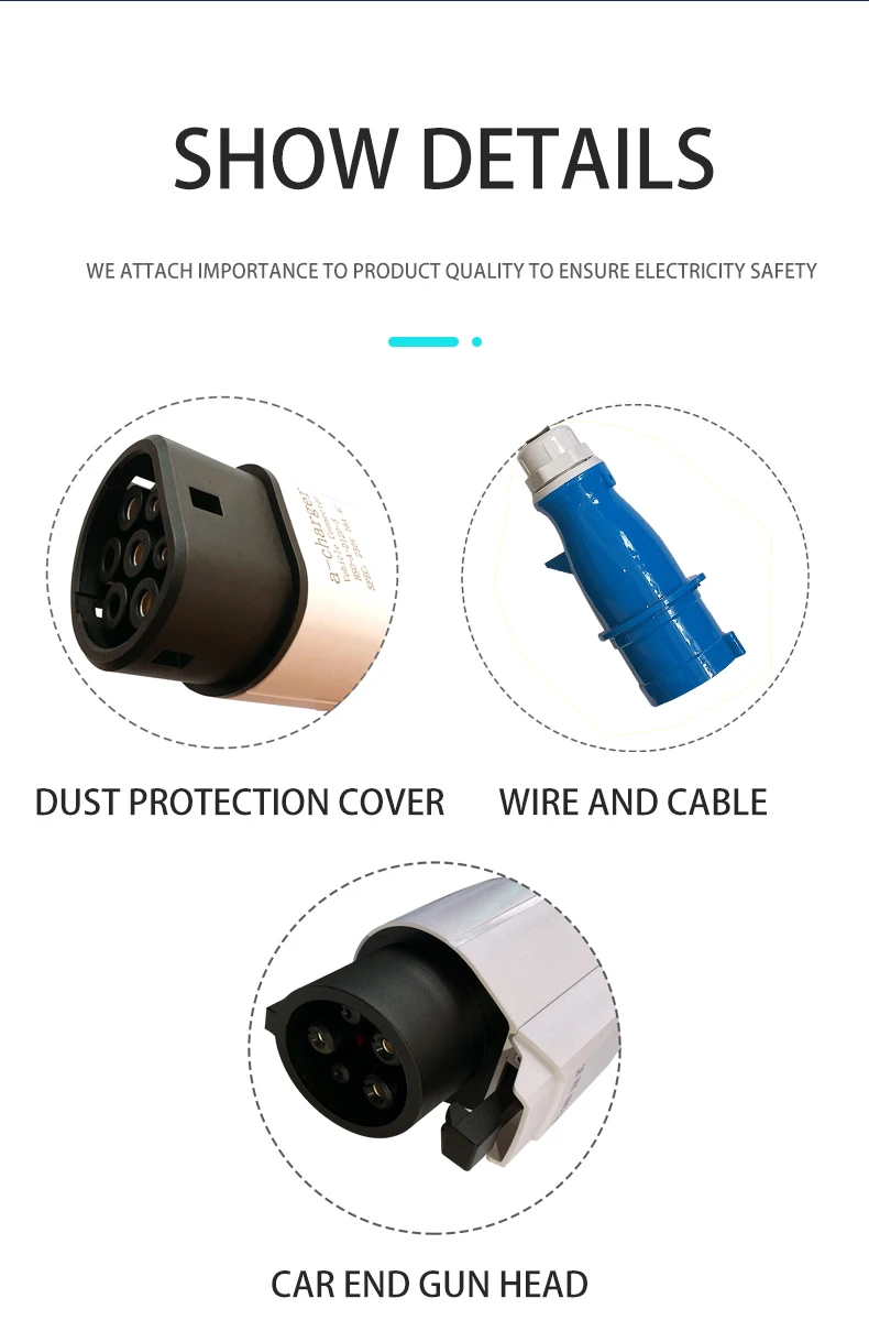 Функция блока управления: 1. Защита от утечки 2. Защита от перенапряжения или низкого давления 3. Защита от перегрузки 4. Защита от молнии 5. Защита от перегрева 6. Ток зарядки: 8A/10A/16A/32A регулируется. Блок управления имеет защиту от перегрева: Когда внутренняя температура блока управления превышает 85 °C, он поступает в защиту от перегрева и останавливает зарядку. После падения температуры до 65 °C, он возобновит зарядку.