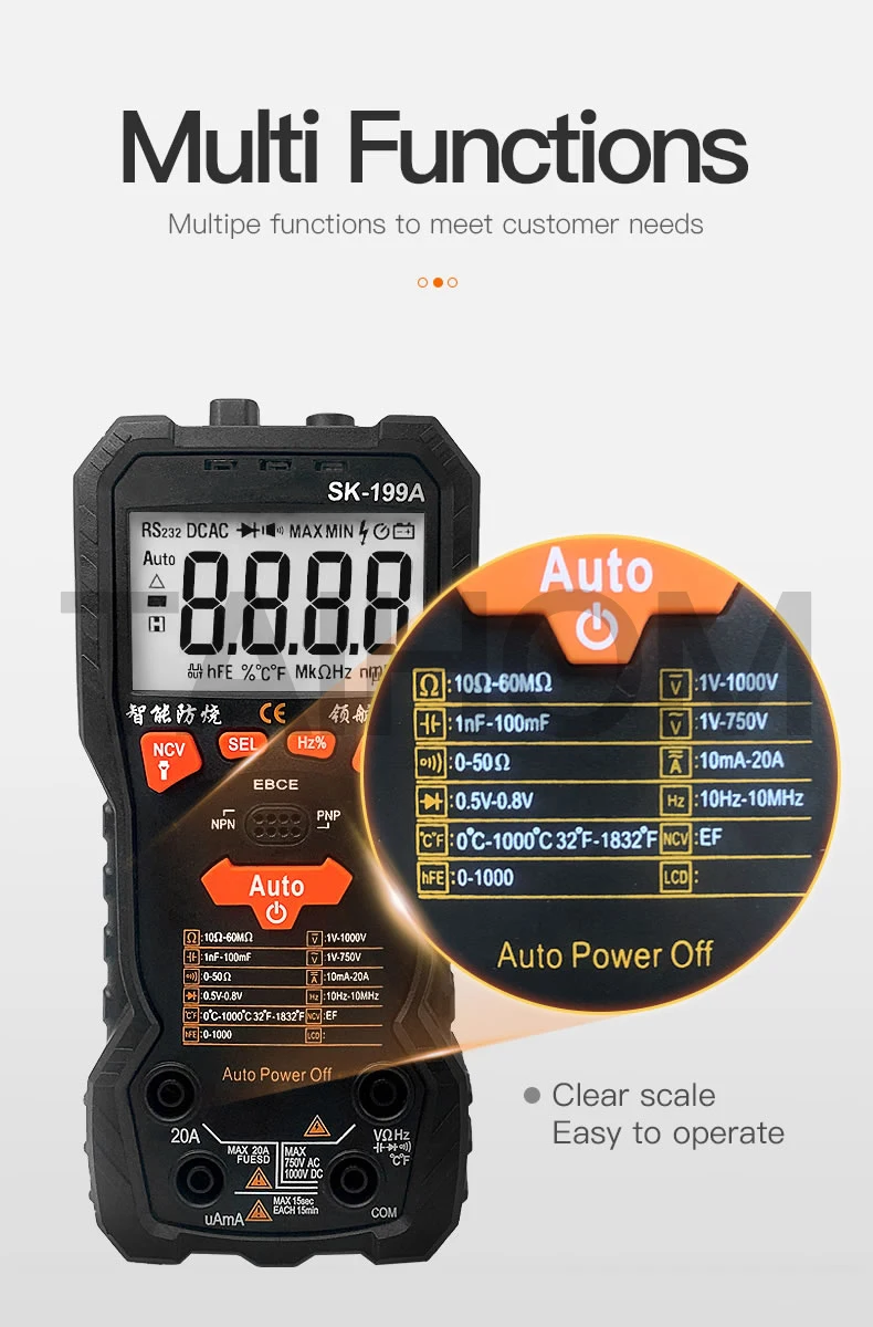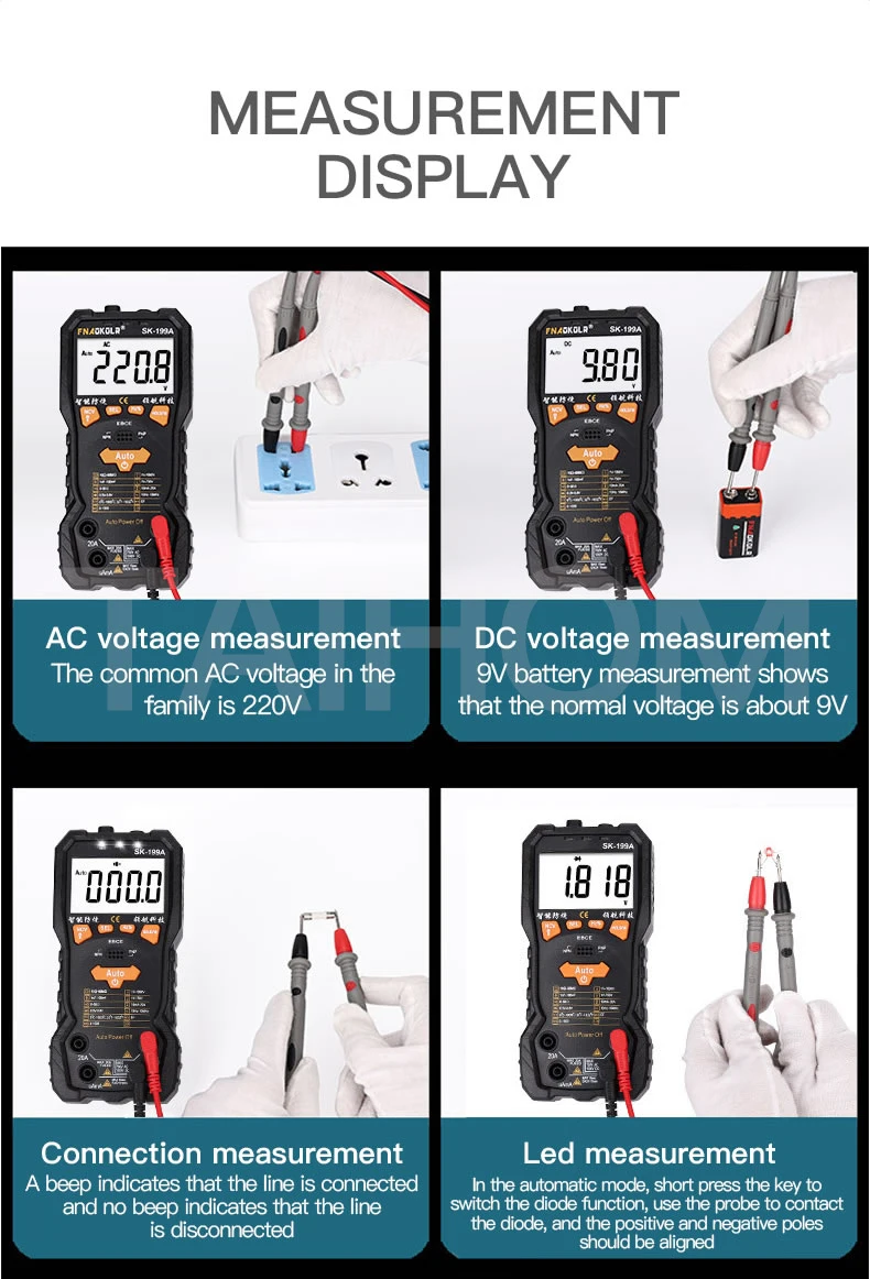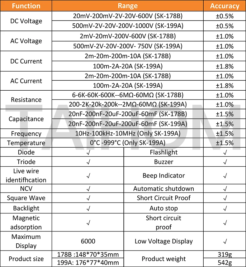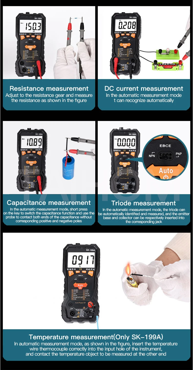 SK-178B / SK-199A: 1) большой ЖК-дисплей 5,1 см/6,0 см 2) максимальный дисплей: Maxium 6000 отсчетов 3) интегрирована интеллектуальная идентификация и ручная функция 4) Диапазон измерения напряжения постоянного тока: 20мв-200мв-2в-20в-600в (SK-178B) 500мв-2в-20в-200в-1000в (SK-199A) 5) дисплей с большим диапазоном: наивысшее положение показывает «OL» 6) дисплей низкого напряжения: индикация низкого заряда батареи 7) Рабочая среда: (0-999)°C 8) Источник питания: 3 батареи 1,5 В (178B) / 1 батарея 9 В 6F22 (199A) (все не входят в комплект) 9) Это стабильная производительность, высокая точность, высокая надежность четкие показания и защита от перегрузки.