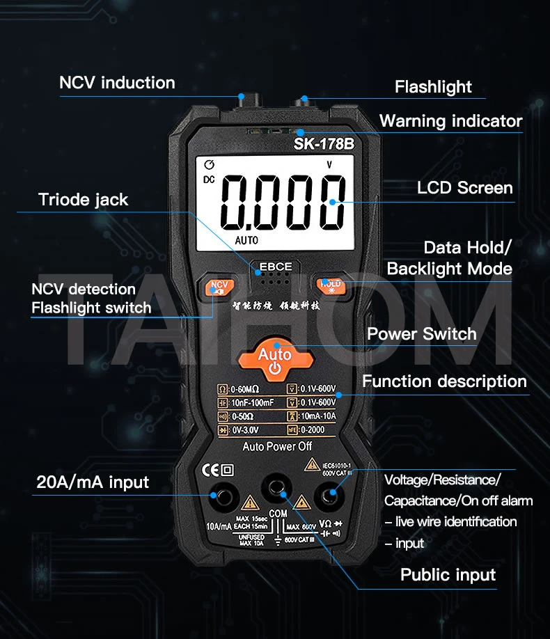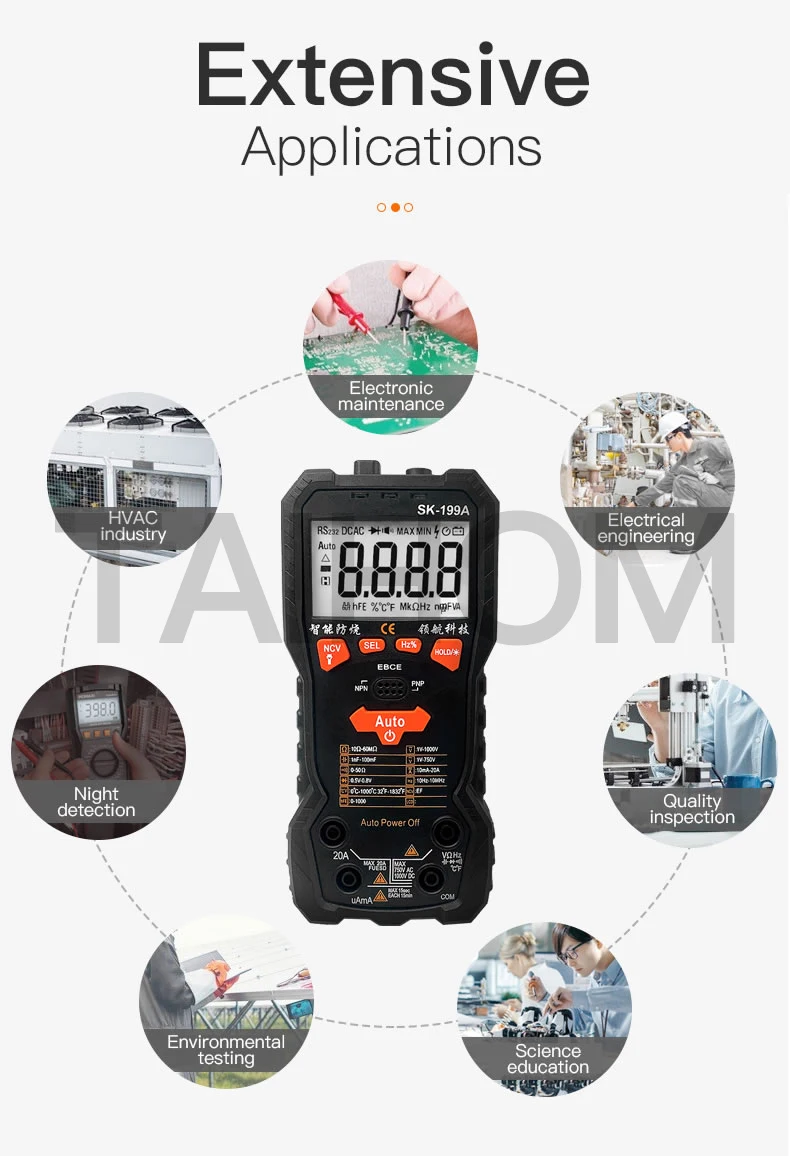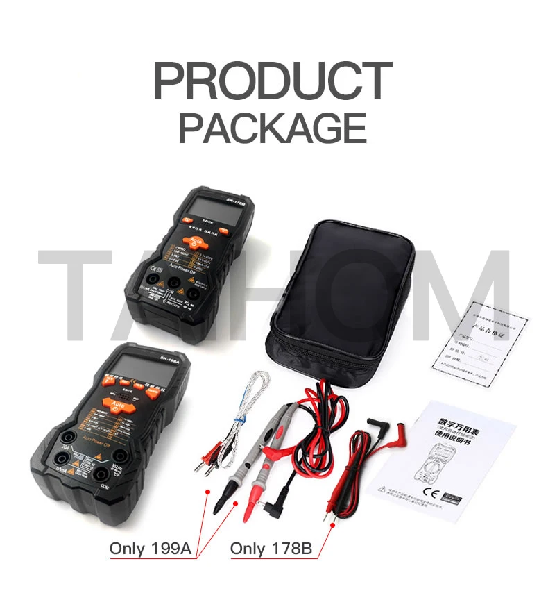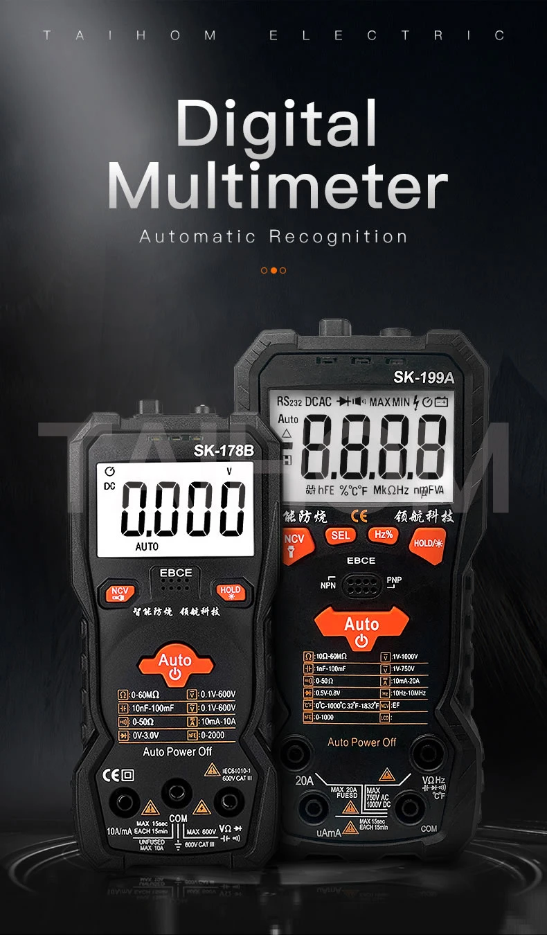 SK-178B / SK-199A: 1) большой ЖК-дисплей 5,1 см/6,0 см 2) максимальный дисплей: Maxium 6000 отсчетов 3) интегрирована интеллектуальная идентификация и ручная функция 4) Диапазон измерения напряжения постоянного тока: 20мв-200мв-2в-20в-600в (SK-178B) 500мв-2в-20в-200в-1000в (SK-199A) 5) дисплей с большим диапазоном: наивысшее положение показывает «OL» 6) дисплей низкого напряжения: индикация низкого заряда батареи 7) Рабочая среда: (0-999)°C 8) Источник питания: 3 батареи 1,5 В (178B) / 1 батарея 9 В 6F22 (199A) (все не входят в комплект) 9) Это стабильная производительность, высокая точность, высокая надежность четкие показания и защита от перегрузки.
