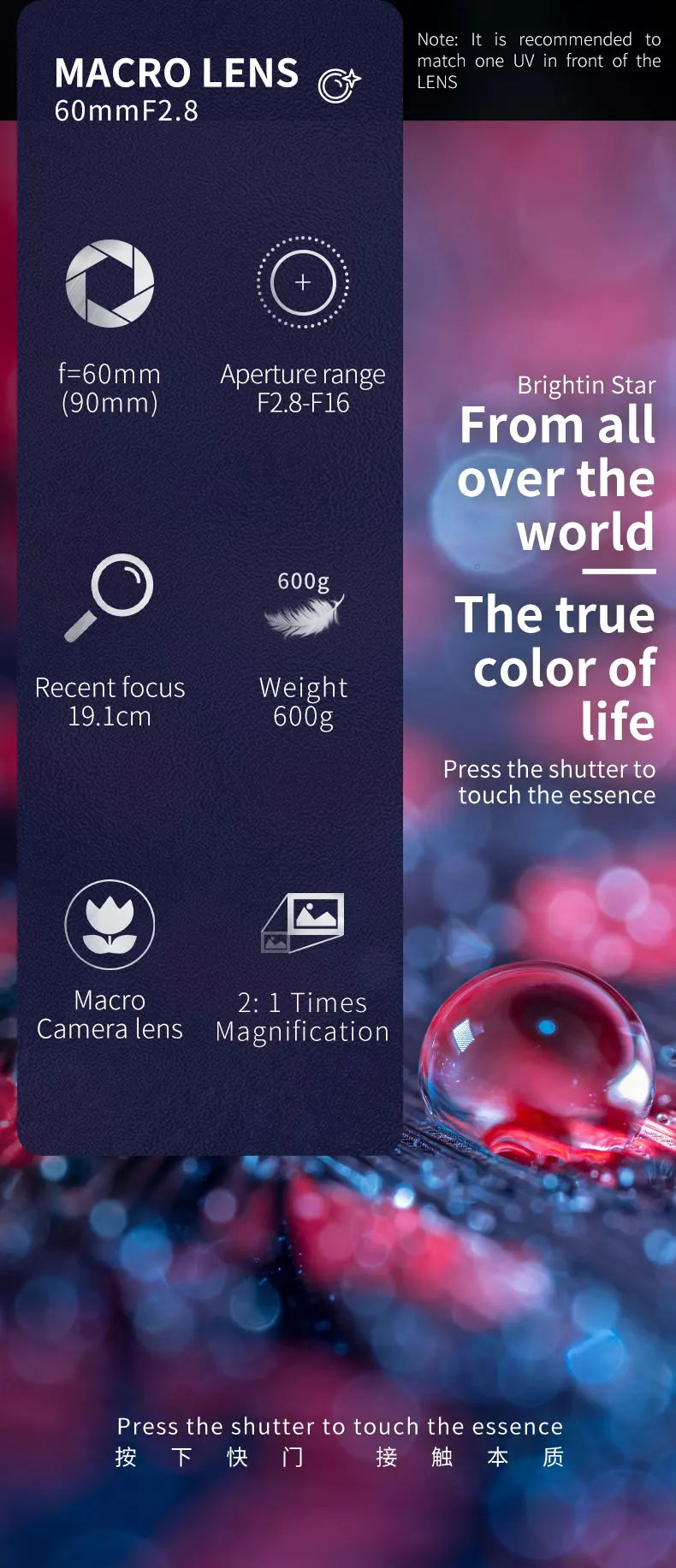 2: 1 Увеличение, 19,1 см ближайшее расстояние фокусировки, ультра-высокий микроскопический эффект в то же время, чтобы убедиться, что картинка чистая без искажений.