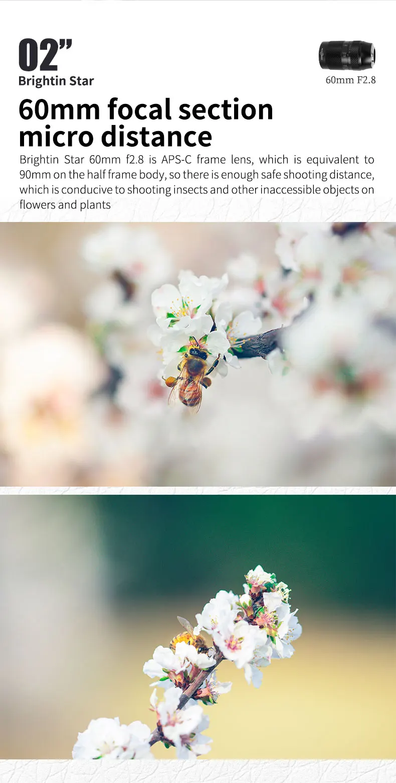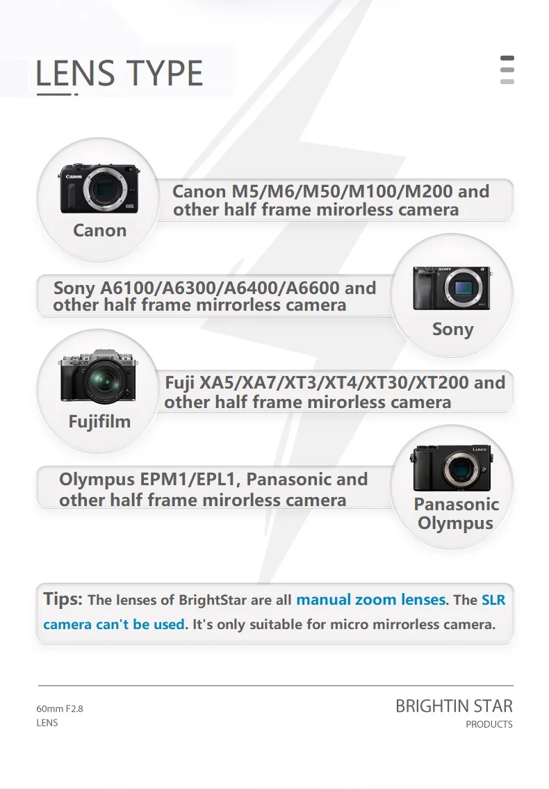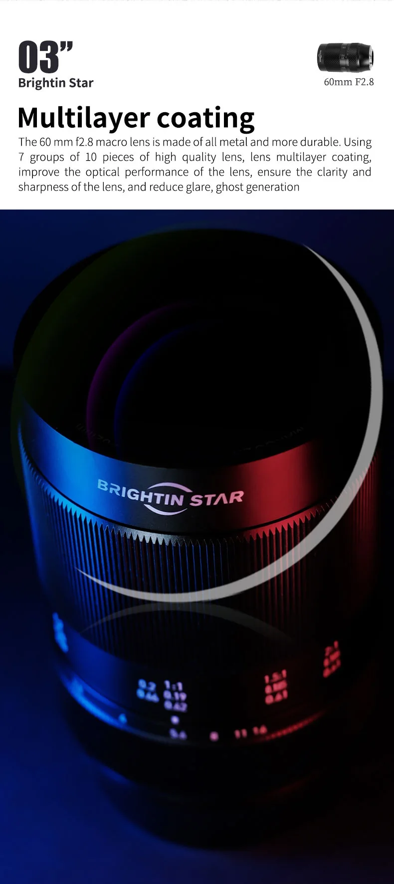 Линзы BrightStar-это все линзы с ручной фокусировкой, которые позволяют наслаждаться изменением изображения при регулировке фокусного расстояния. Он оснащен шкалой фокусировки для достижения быстрой и точной фокусировки.