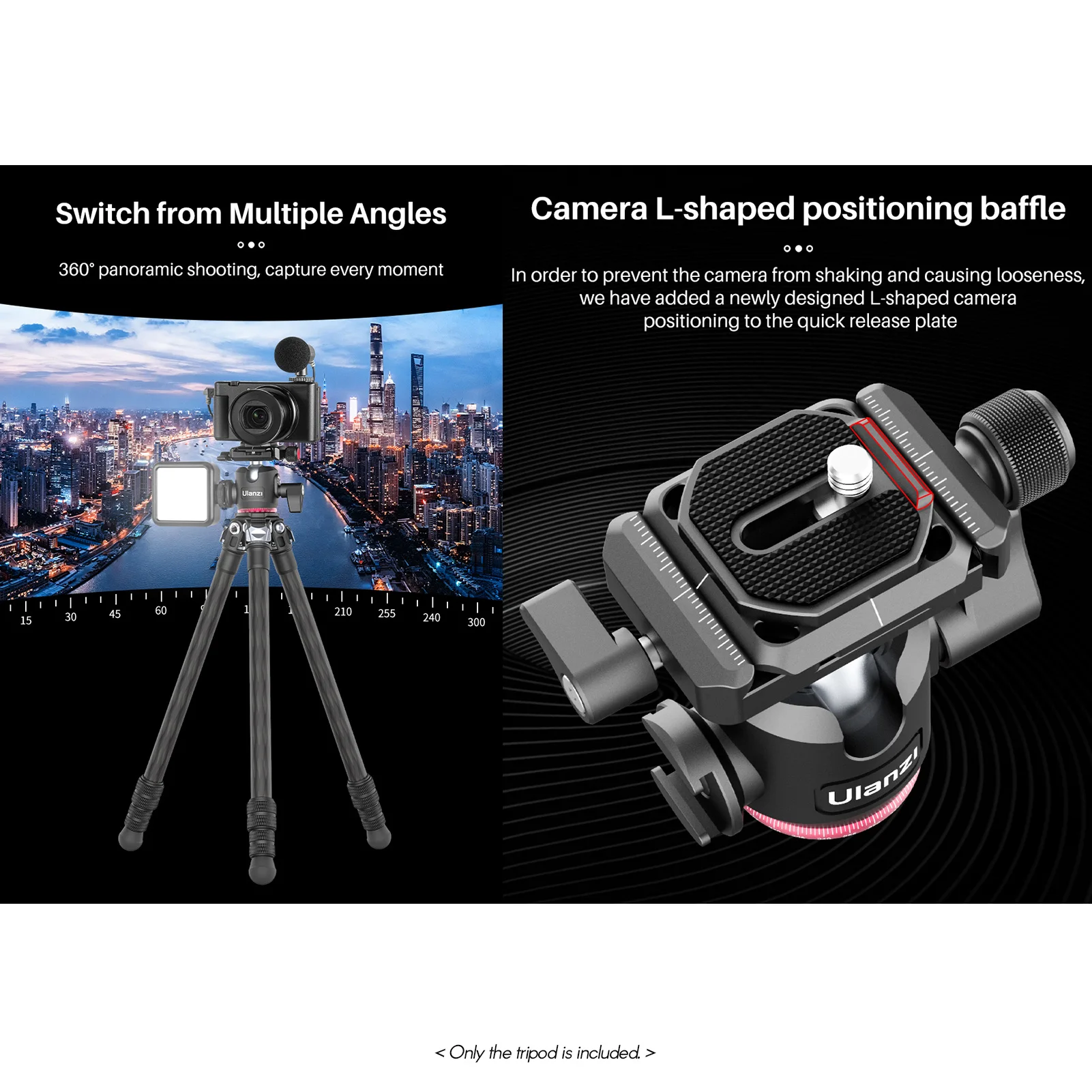 Другие практические дизайны:Внешнее резьбовое отверстие 1/4 дюйма для подключения Волшебной руки и другого фотографического оборудования; Сменная конструкция шипа, подходит для различных наружных площадок; l-образная камера позиционирования перегородка на qr-пластине, чтобы предотвратить тряску камеры и привести к ослаблению.