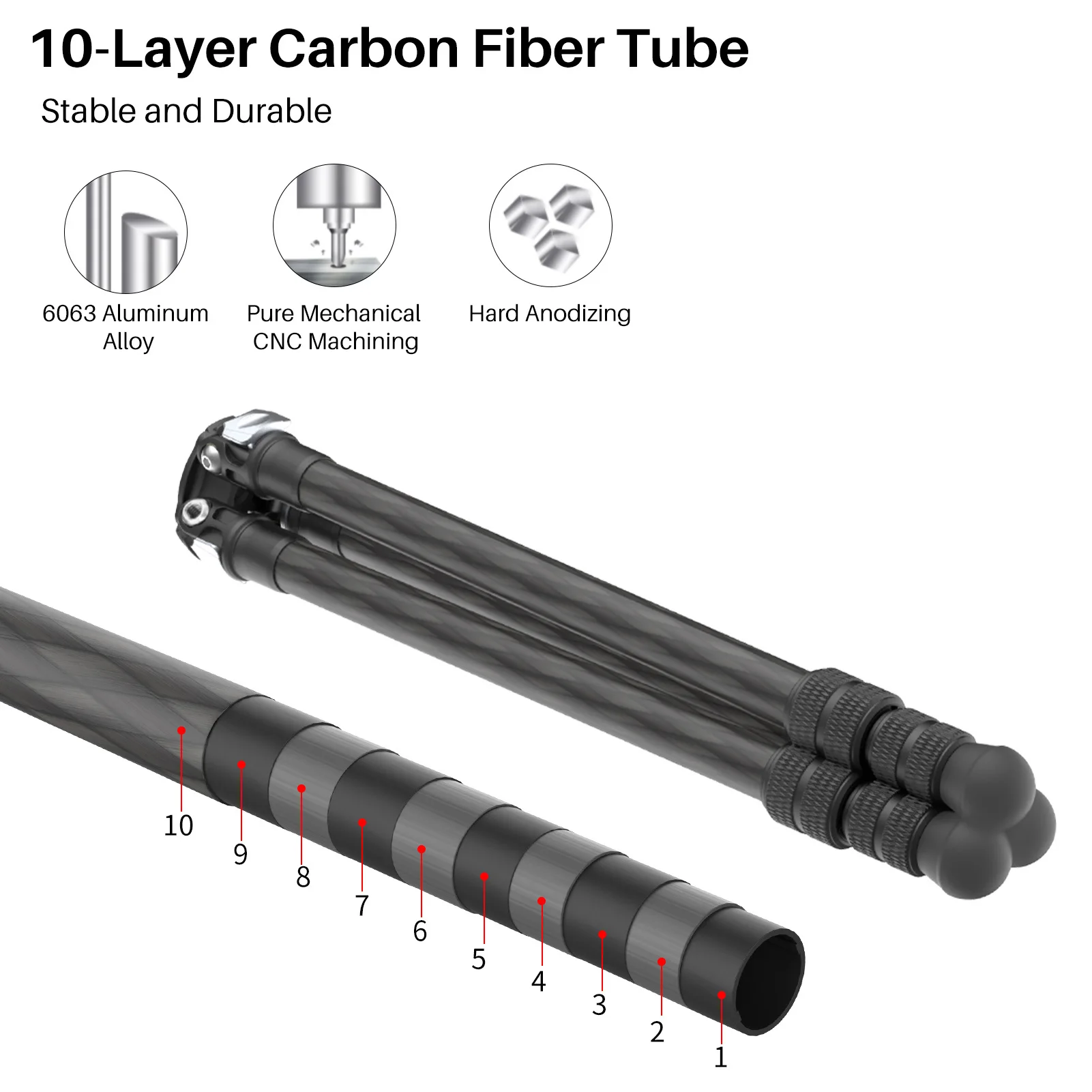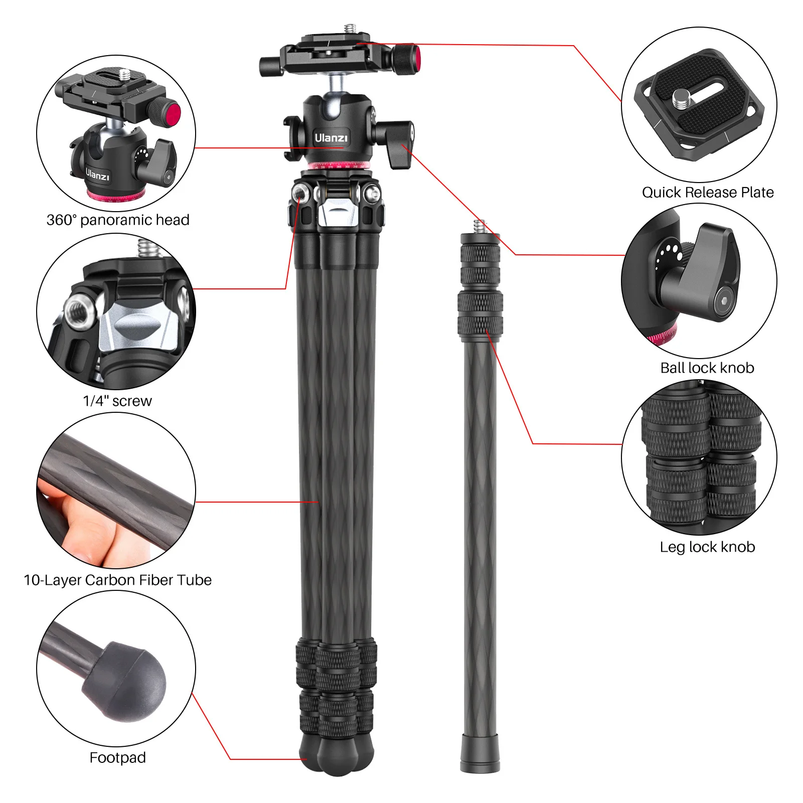 Портативный штатив из углеродного волокна:10-слойный углеродное волокно трубка, принимает чистый механическая обработка с ЧПУ и жесткое анодирование, Стабильная и надежная;Длина в сложенном виде составляет всего 379 мм, Легкий и портативный, что делает ваше путешествие проще.