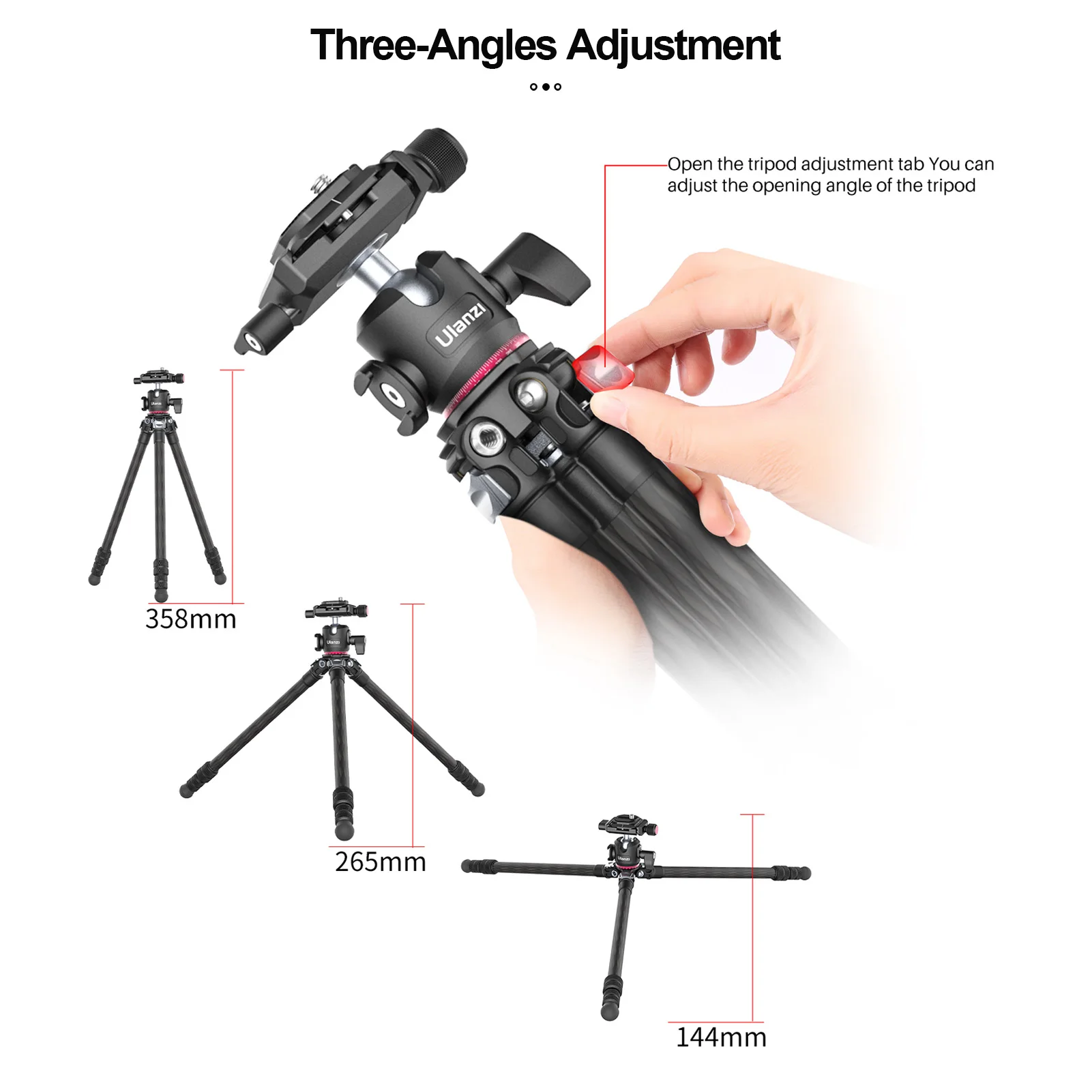 Регулируемая высота и угол открытия:3 секции Телескопические ножки для регулировки высоты использования гибко, плюс дополнительная центральная осьМаксимальная высота использования до 1369 мм; И вы также можете открыть вкладку регулировки штатива для регулировки угла открытия штатива для более гибкой съемки.