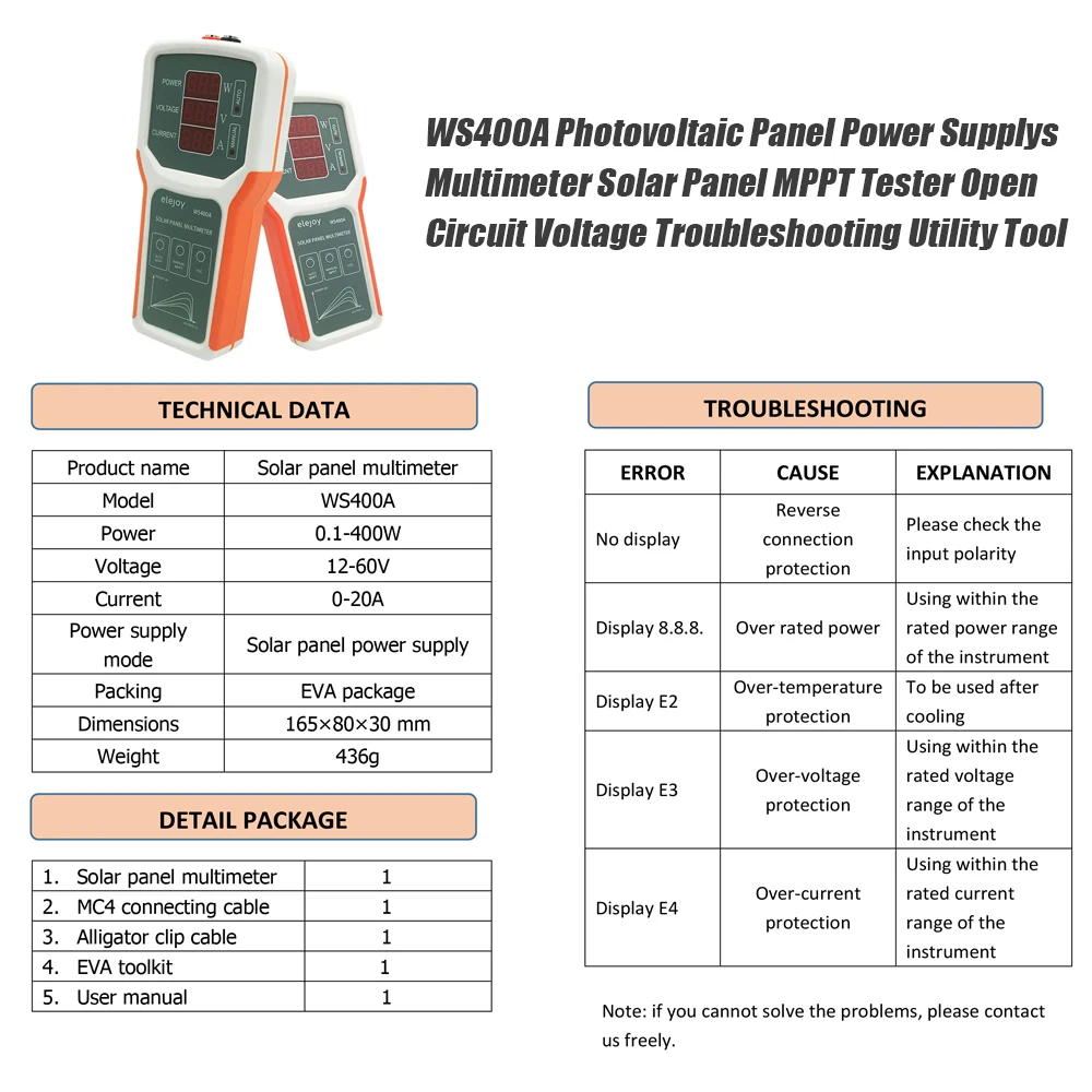 Этот мультиметр для солнечной панели может протестировать максимальную точку мощности и напряжение открытой цепи фотоэлектрической панели, а также использовать фотоэлектрическую панель для поддержки мощности. С портативным дизайном, легко держать. Приходите и попробуйте, это не подведет вас.