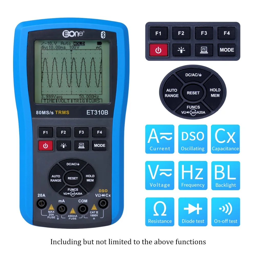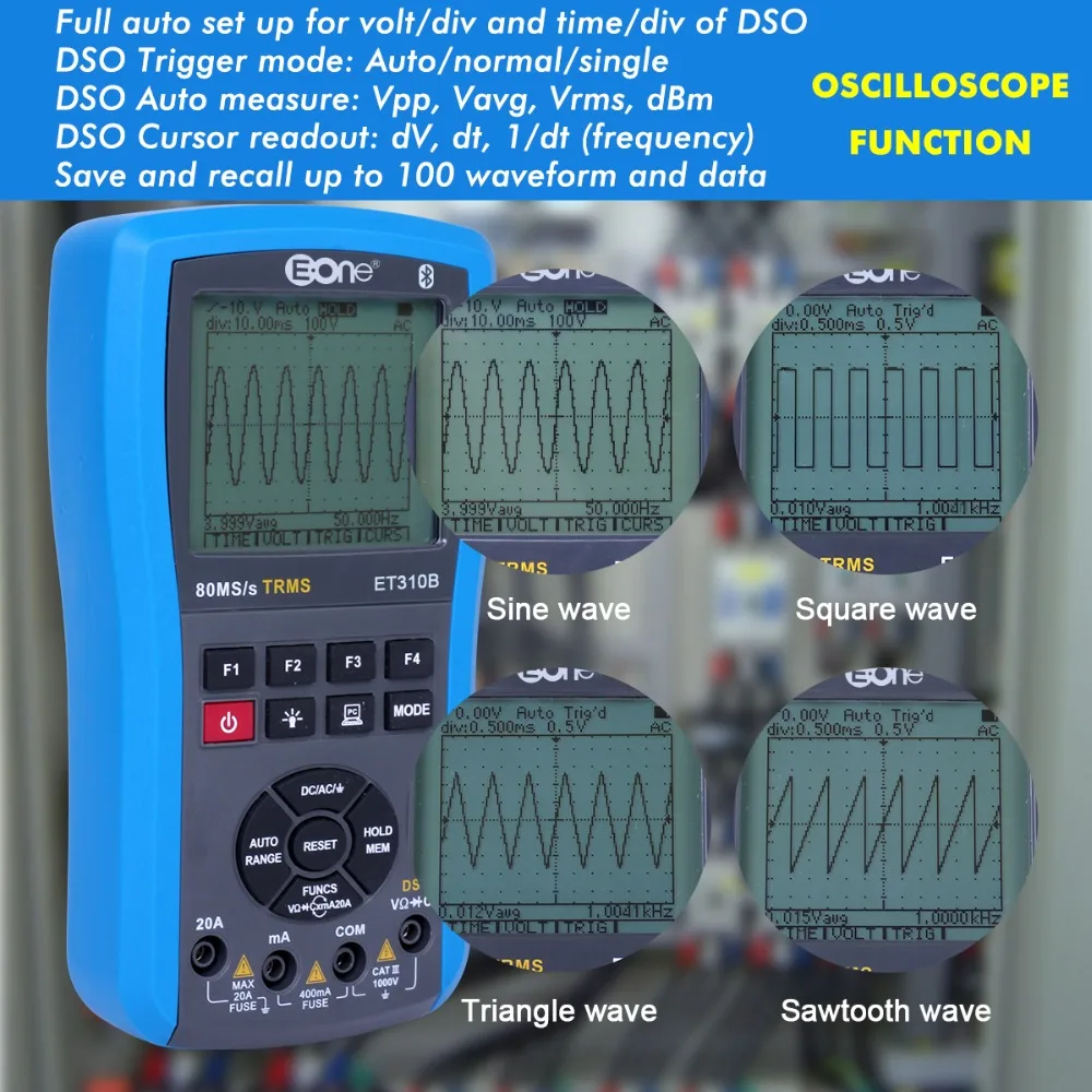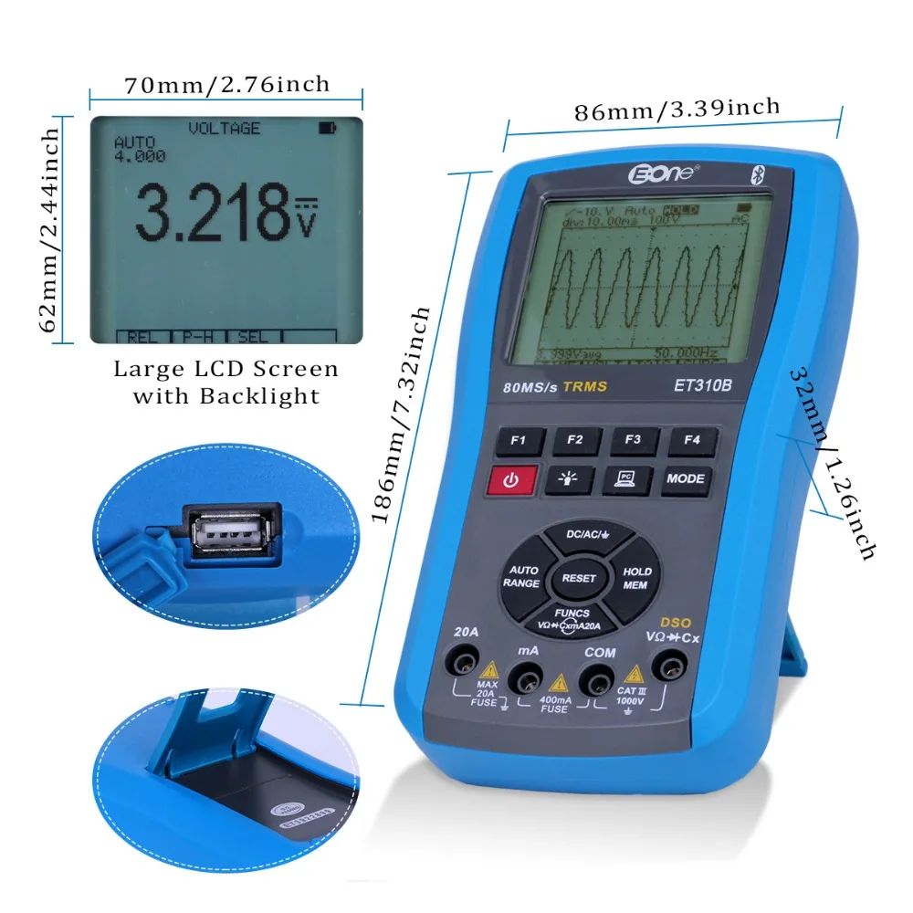 ET310B: это сочетание цифрового мультиметра и осциллографа! Уникально, беспроводной расширенный дизайн bluethooth позволяет вам более легко проверить и справиться с измерением данных и формы волны в интеллектуальных терминалах телефона Android!