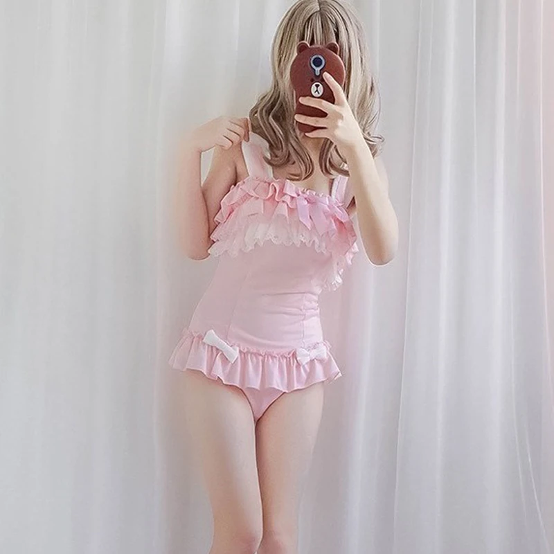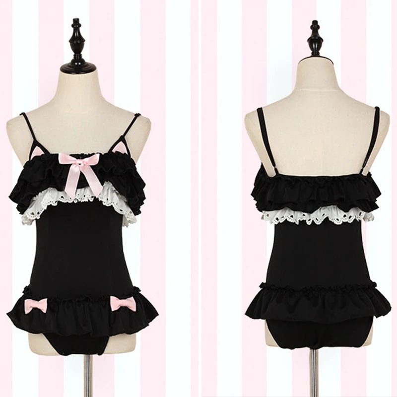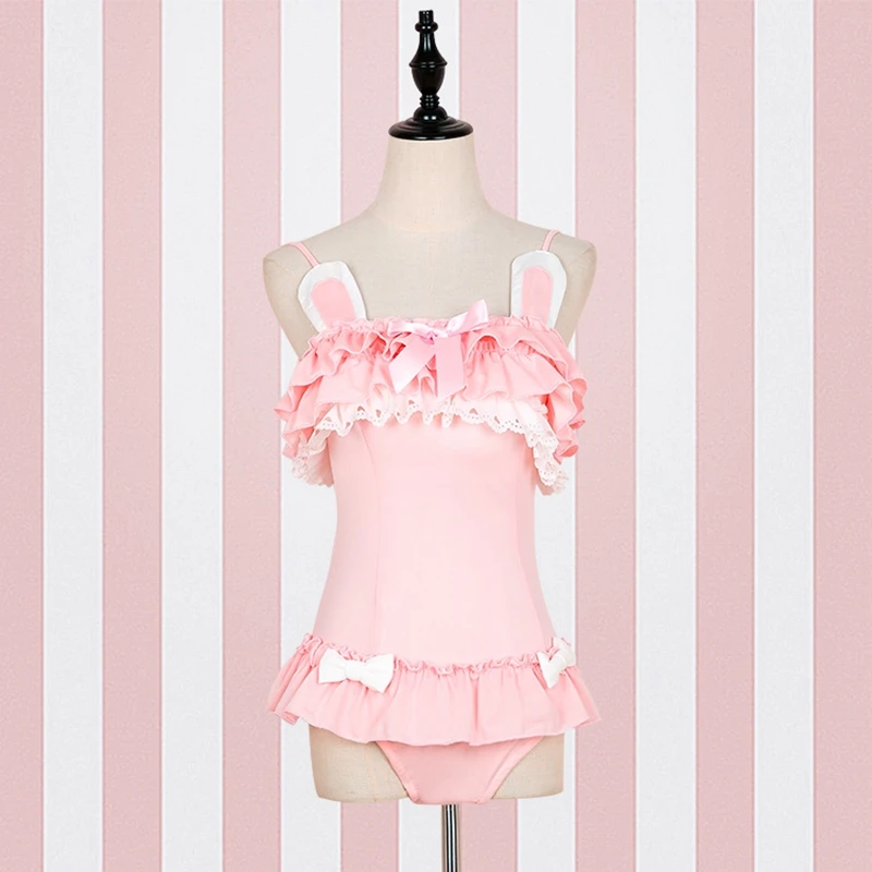 Японский слитный купальник Лолита Sukumizu с рюшами, милый сексуальный женский купальник для косплея из аниме, милый купальник с черной кошкой и пудровым кроликом
