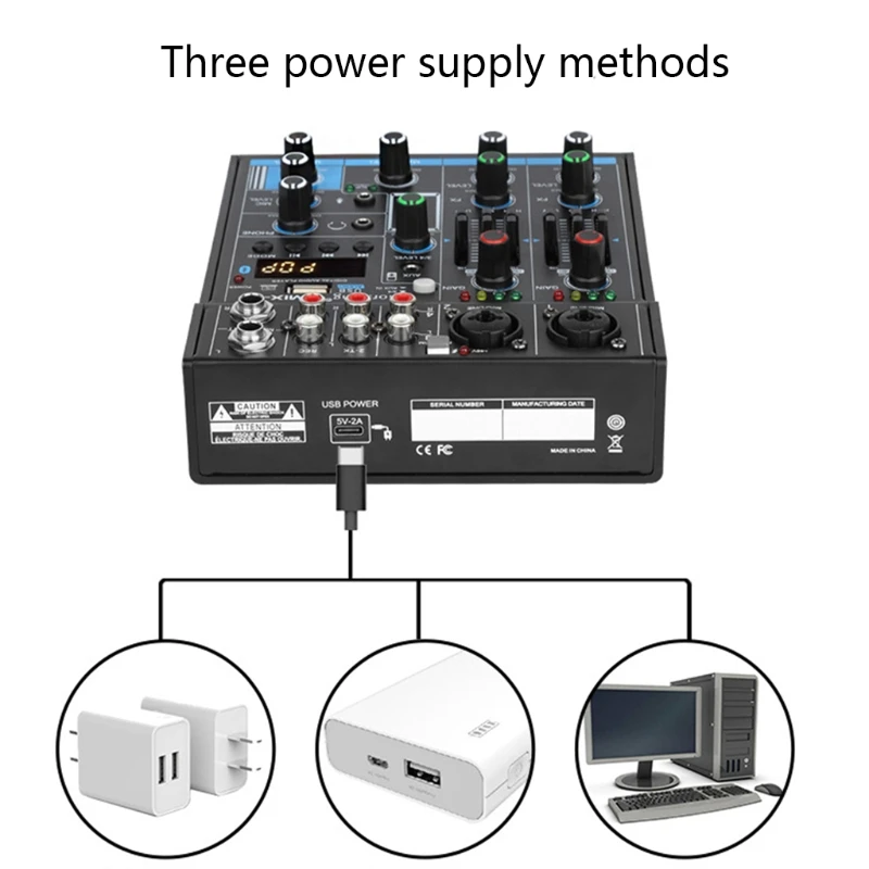 Особенности:Профессиональный 4-канальный микшерный пульт с bluetooth и звуковая карта, 3,5 мм для наушников, 48В, кнопка включения микрофона, 1/2 независимых индикатор сигнала.