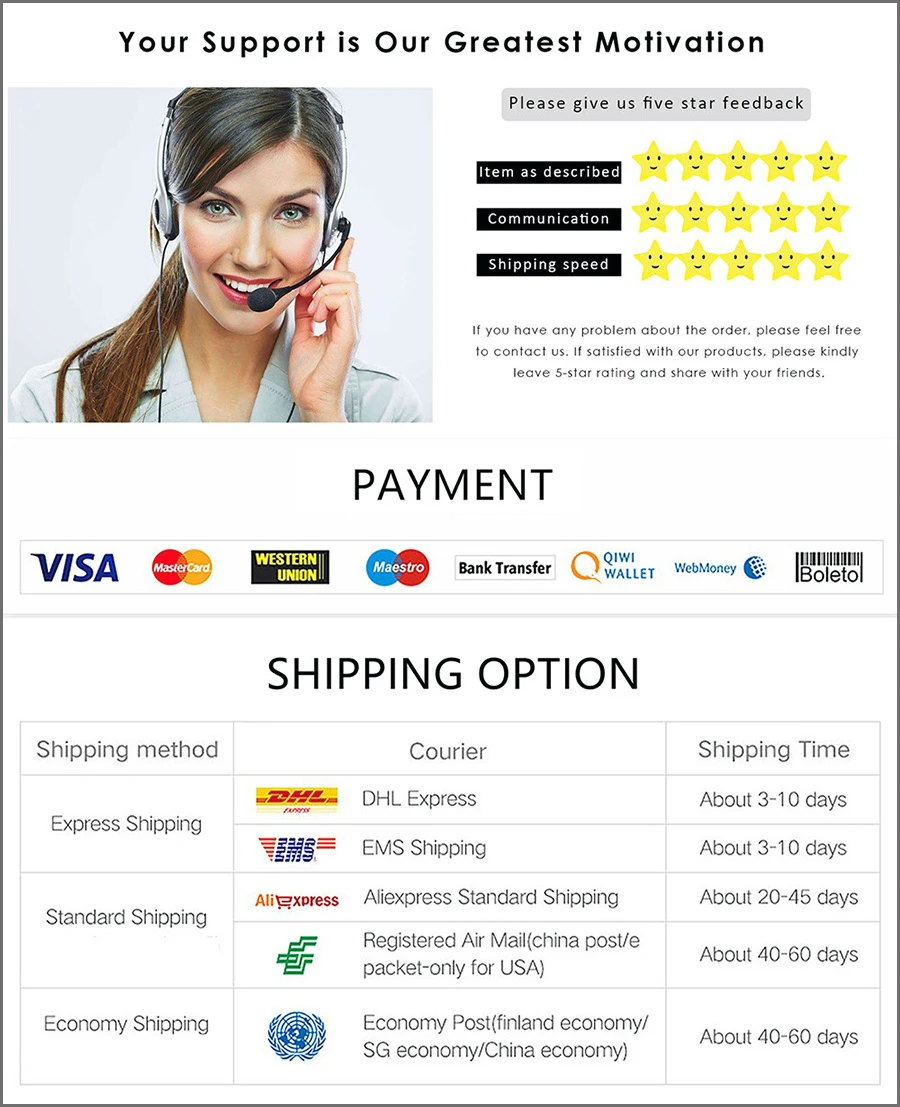 Мы искренне приглашаем вас оставить положительные отзывы 5 звезд в подробном рейтинге продавца для нас, если вы довольны нашим товаром и сервисом. Это займёт у вас всего 1 минуту. Спасибо за вашу поддержку!