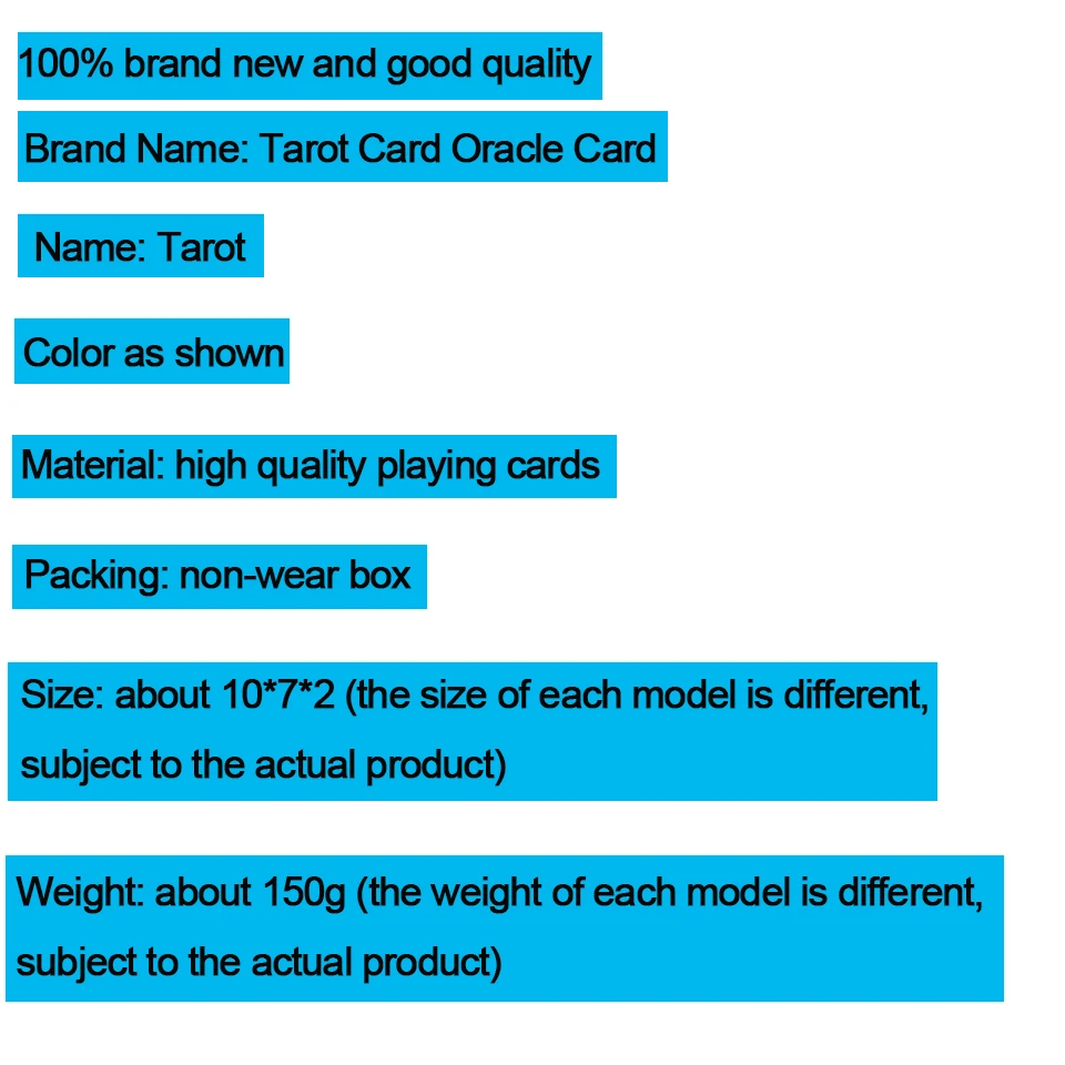Различные стили карт Таро магические карты гадания Семейные посиделки персональные колоды игровые карты полный английский QR код голограммаДобро пожаловать в наш магазин, вы купите высококачественные игрушки в этом магазине, и вы также можете получить купоны в этом магазине, чтобы получить больше скидок. Пожалуйста, обратите внимание на наш магазин, чтобы мы могли предложить вам новые продукты. Если вы не можете найти то, что вам нужно на этой странице, пожалуйста, уделите немного времени, чтобы посетить наш магазин. Может быть продукт, который вам нравится, спасибо!