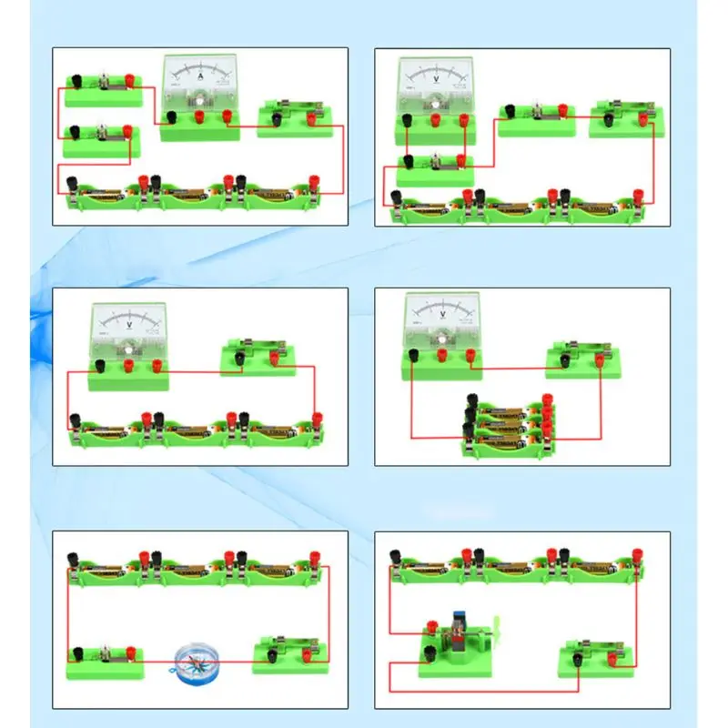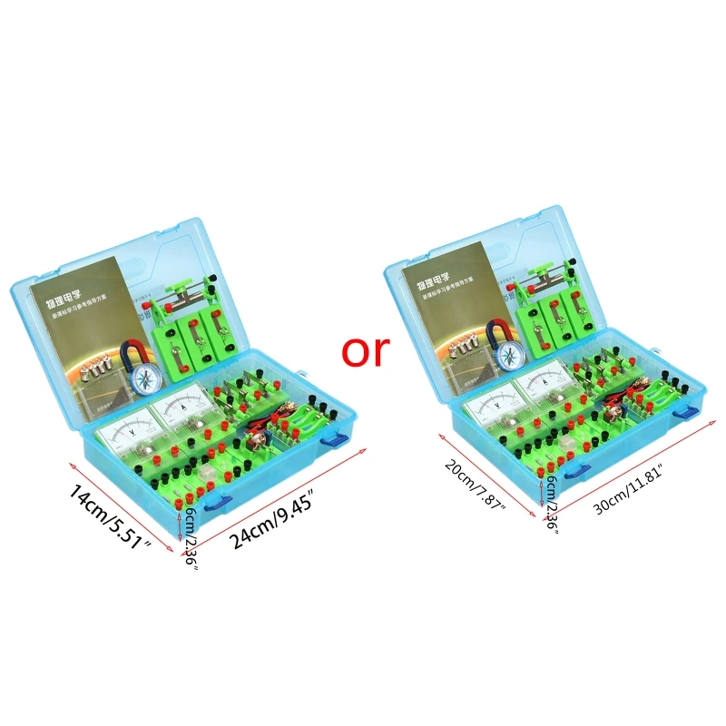 Цепи серии, параллельные цепи, фруктовая батарея, измерьте неизвестный резистор с законом Ом, Oersted эксперимент, электромагнит, исследование силы Amper, Электрический колокольчик и ручной Кривошип генератор.