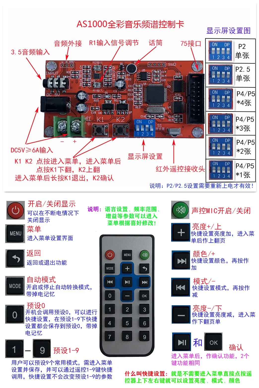 1. AS1000 is our flagship spectrum product, using a higher-level 32-bit ARM processor. This spectrum control card can drive 1-4 conventional P4, P5, P6 full-color screens, or a single P2, P2.5 high-density screen ; With rainbow gradient color display, the frequency spectrum display is precise, accurate, and beautiful, and can be used for frequency point testing.