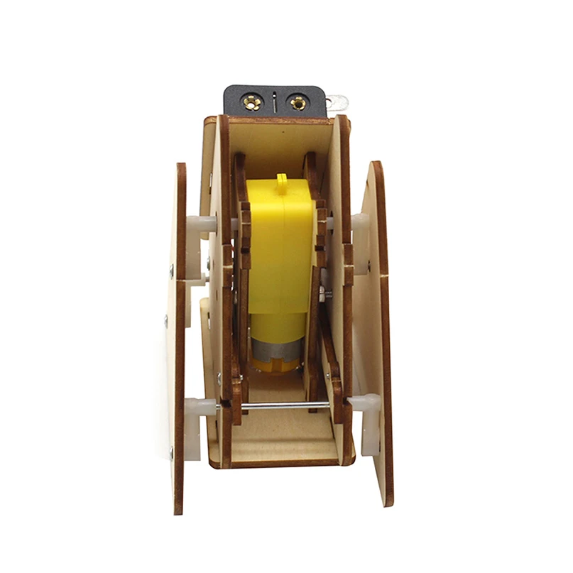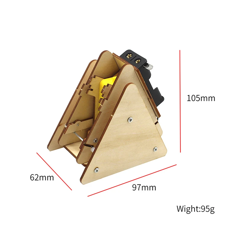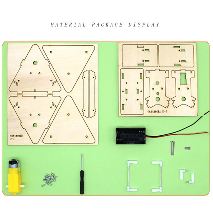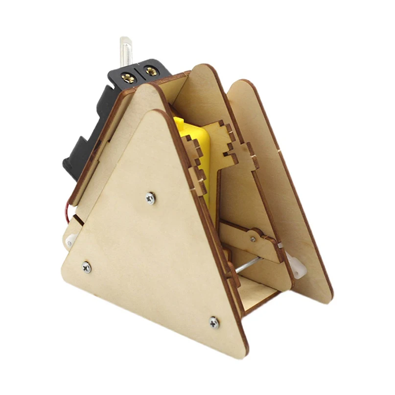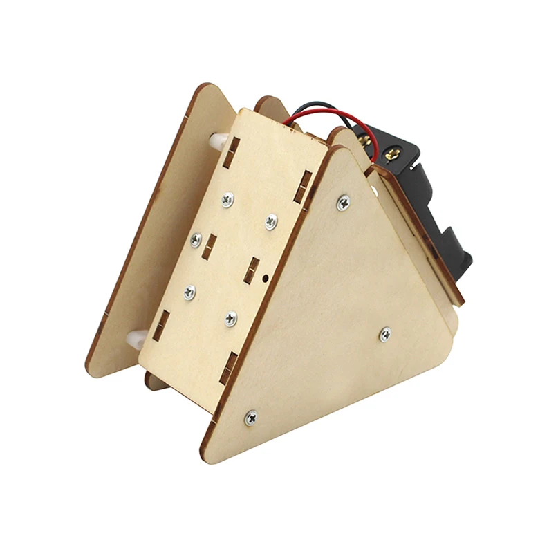 Этот «треугольный робот» прост и интересен в сборке, что очень подходит для установки детьми. После того, как батарейный блок будет заряжен двигателем, вал двигателя будет вращаться. Потому что вал двигателя соединен с коленчатым валом и кривошипом, и Кривошип + коленчатый вал соединен с деревянной доской. Когда вал двигателя вращается, он вращает деревянную доску, а затем «треугольный робот» будет ходить.