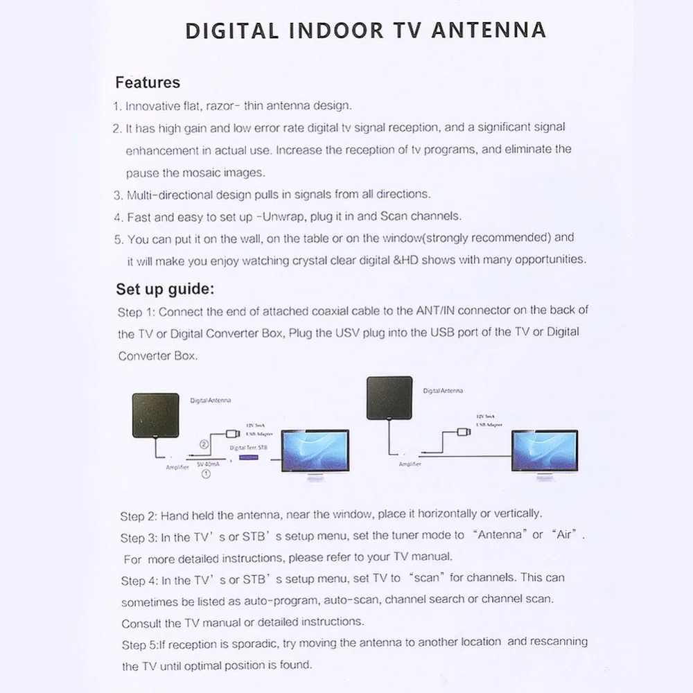 Эта антенна захватывает сигналы в диапазоне 880 миль, технология кристаллического фильтра фильтрует Сотовые и FM сигналы, что приводит к малошумному, более четкому изображению и доступу к более бесплатным телевизионным сигналам с более высоким коэффициентом усиления, диапазон и частотная производительность.